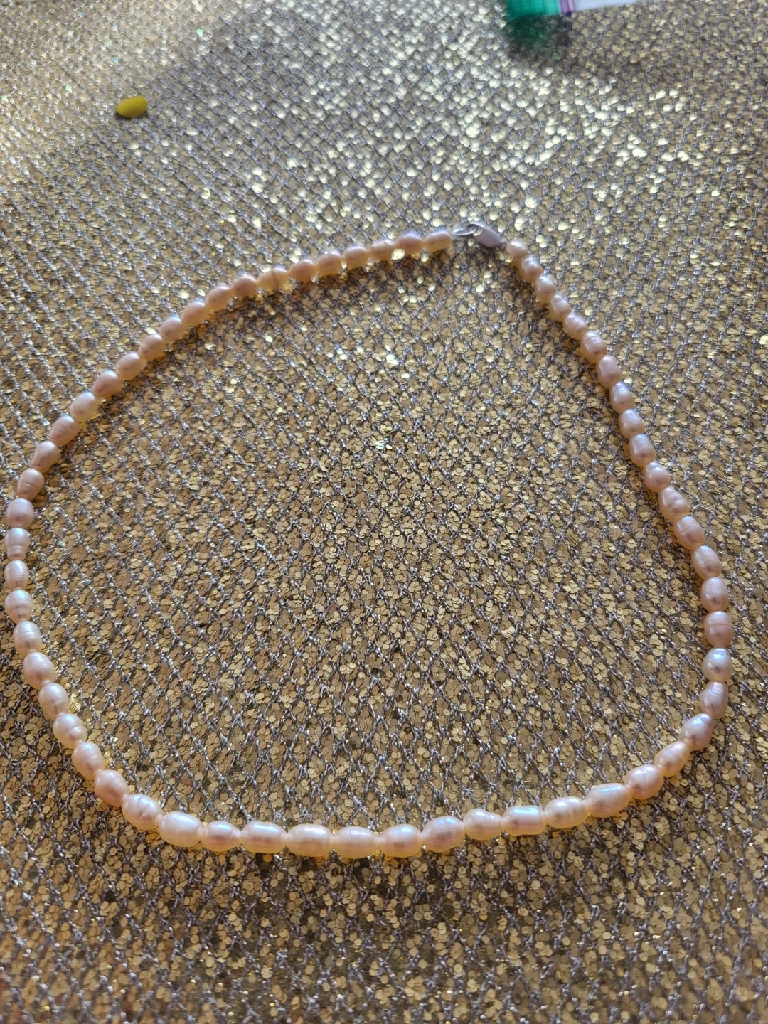 This is a delicate necklace strung with lovely oval-shaped freshwater pearls. It's a classic accessory that'll go with almost anything. The clasp is a simple silver-tone metal.