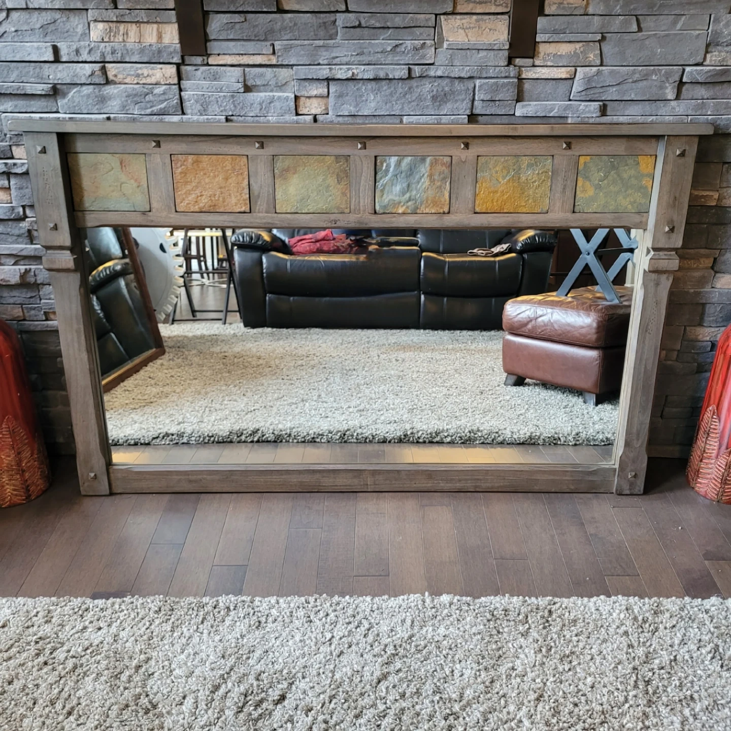 This heavy duty MIRROR features a rustic wooden frame with decorative stone inlays. It's a great statement piece for a living room, atop a dresser, or in an entryway. The back is solid wood, offering a sturdy construction.
