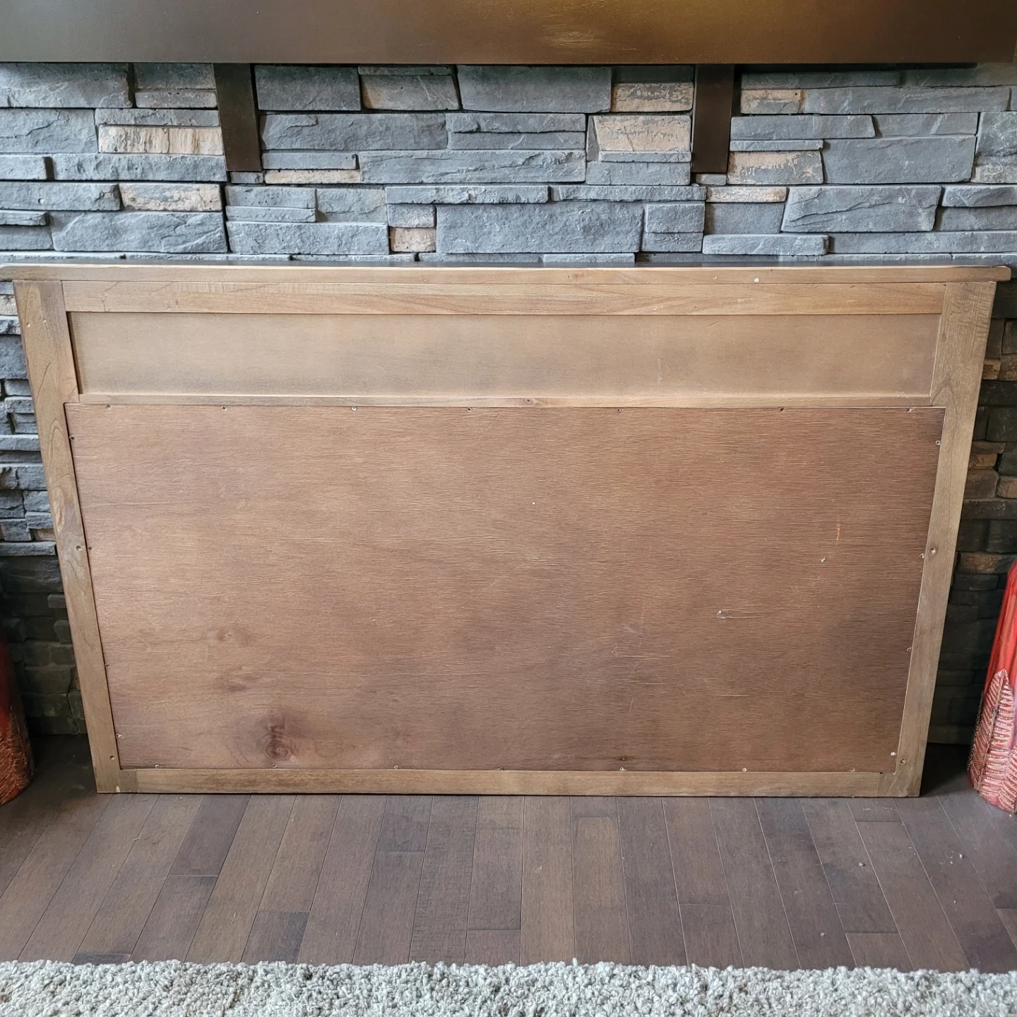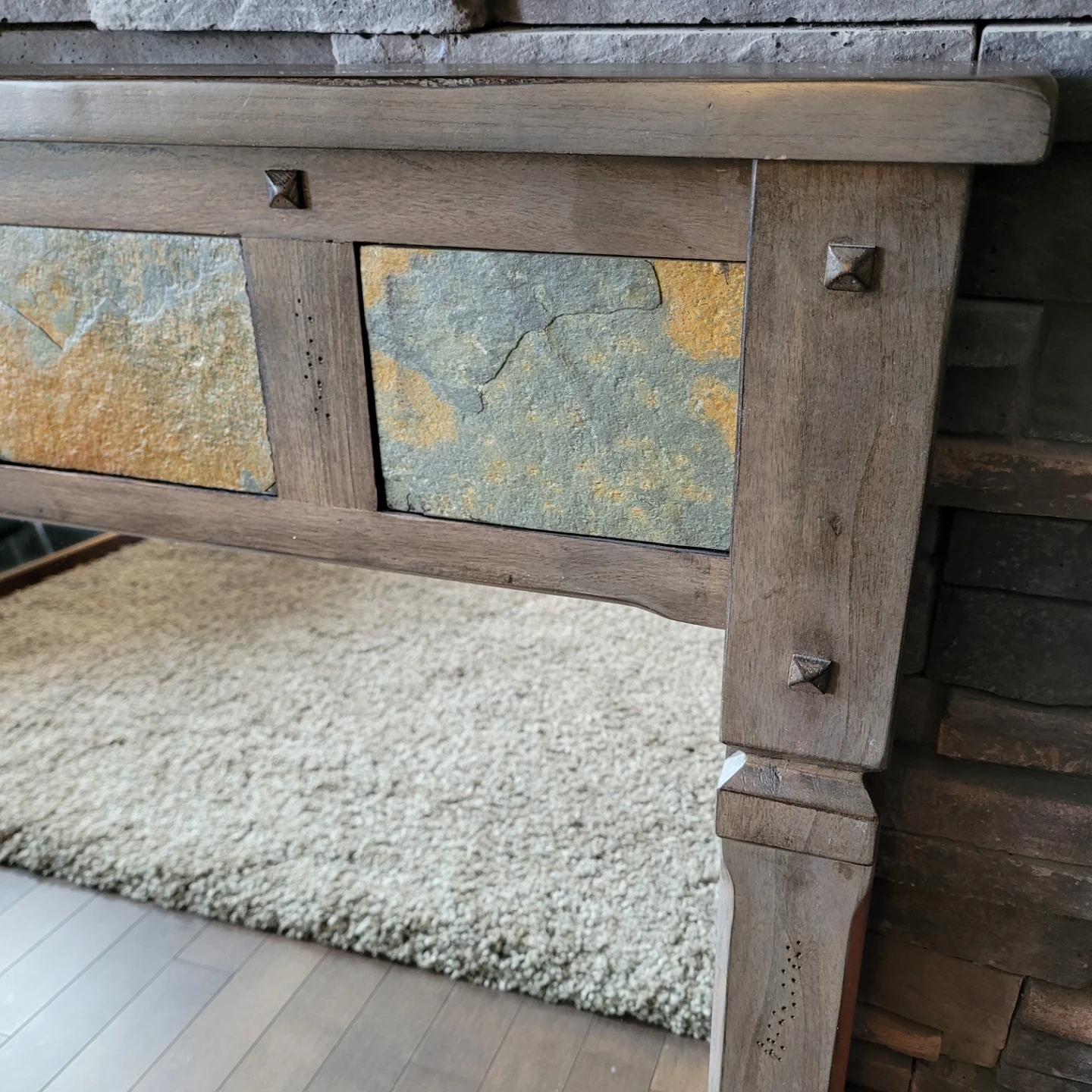This heavy duty MIRROR features a rustic wooden frame with decorative stone inlays. It's a great statement piece for a living room, atop a dresser, or in an entryway. The back is solid wood, offering a sturdy construction.