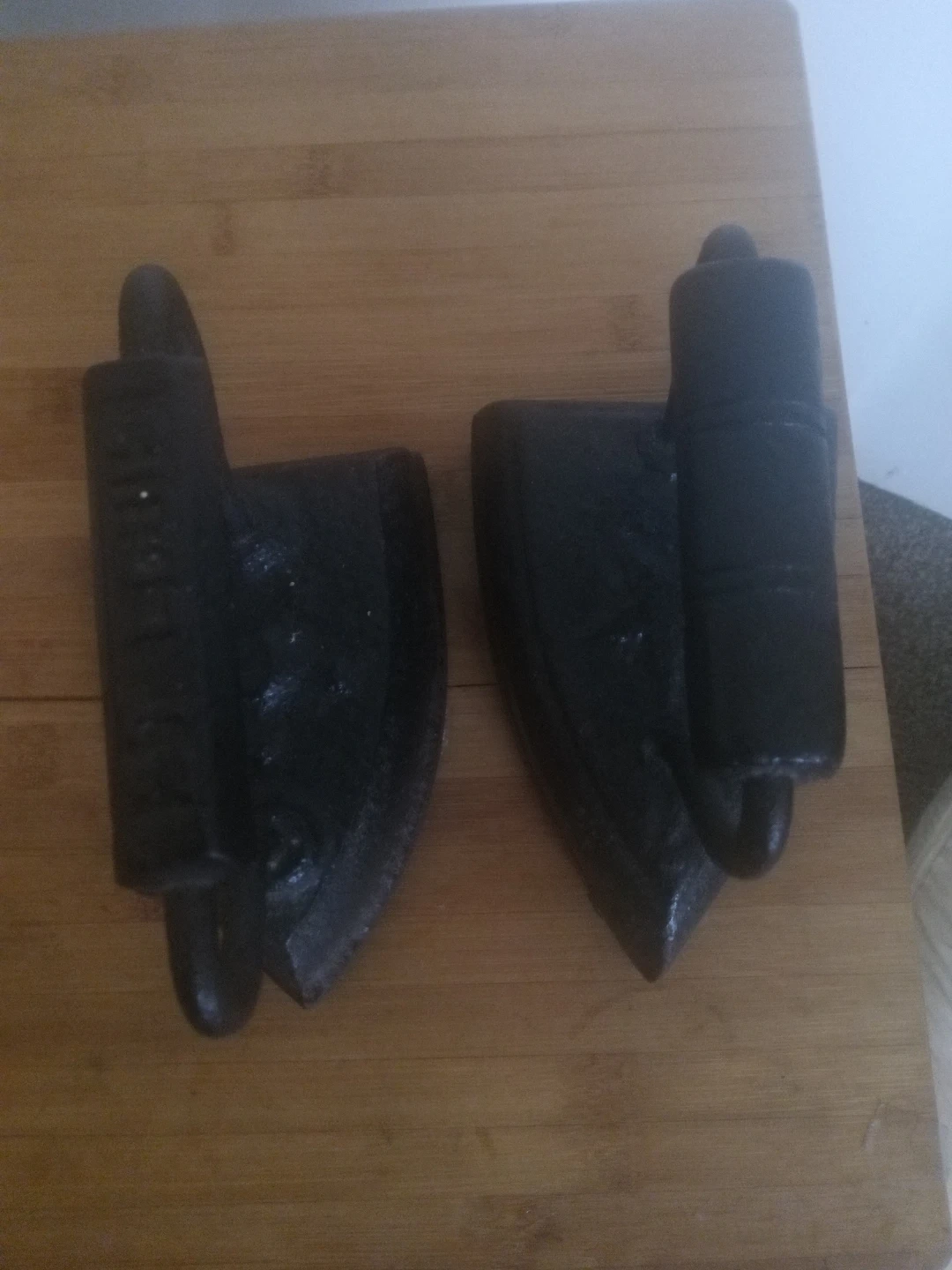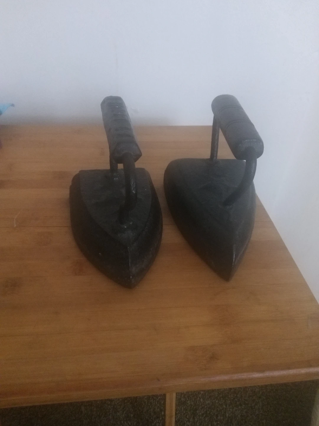 This listing is for a set of two vintage cast iron clothes irons. They appear to be made of heavy cast iron & handles. These irons are classic decorative pieces for home or sewing room decor. A great display item for anyone who collects antique housewares!
