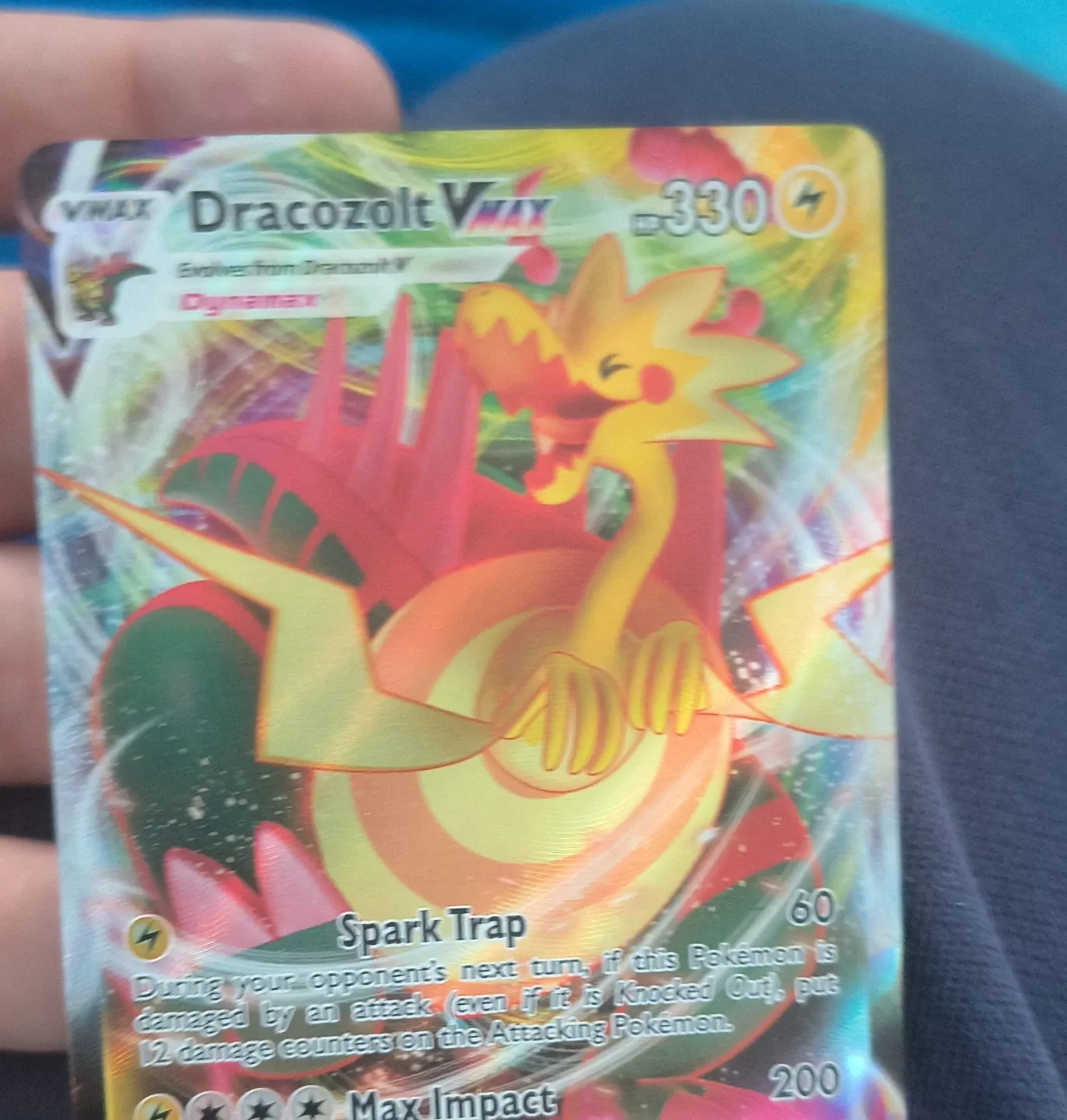 This is a VMAX Dracozolt V VMAX Pokemon trading card. It has 330 HP and the Spark Trap ability. Max Impact attack deals 200 damage.