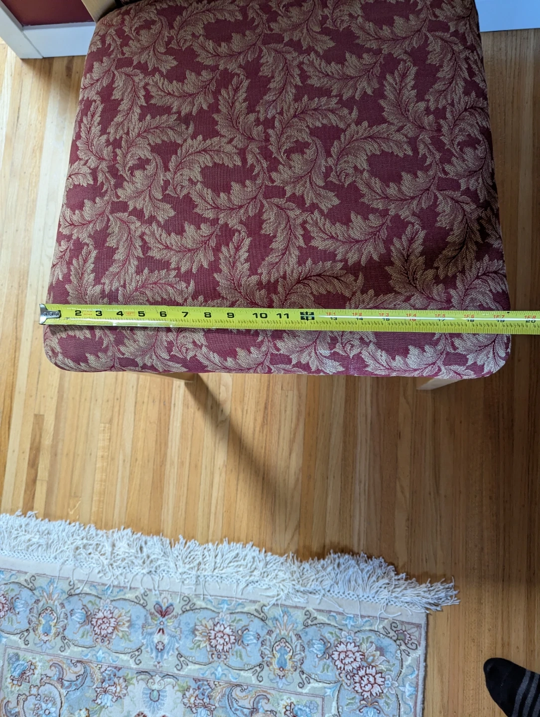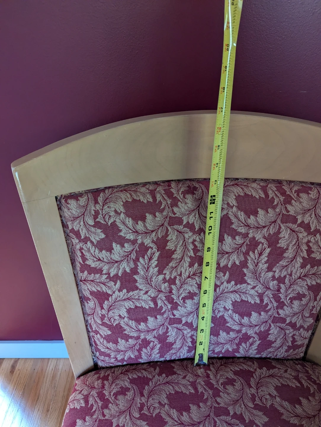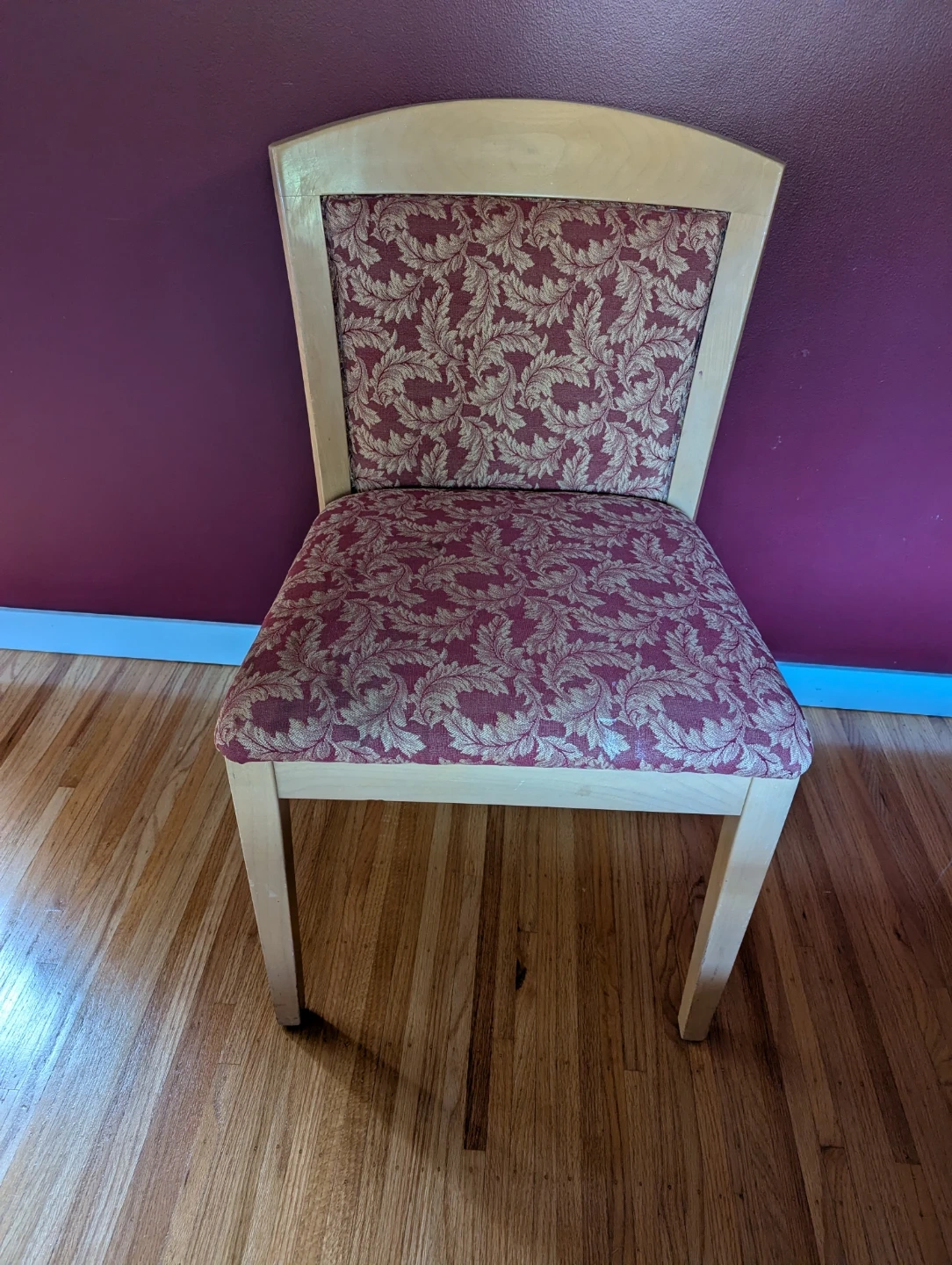A comfortable dining chair with a light wood frame and upholstered seat and back. The fabric features a maroon and gold floral pattern. Seat width is approximately 19 inches. Both chairs are sturdy, clean, and great as dining or accent pieces.