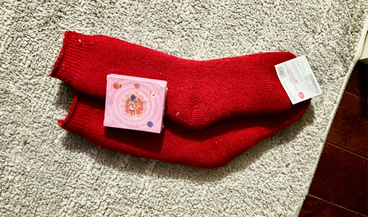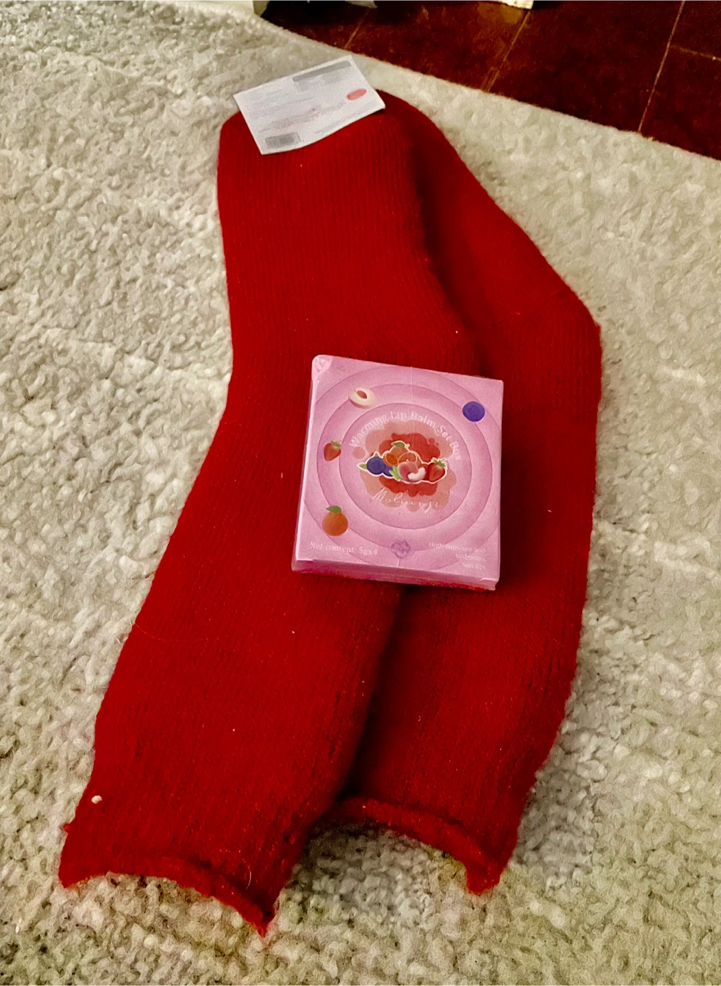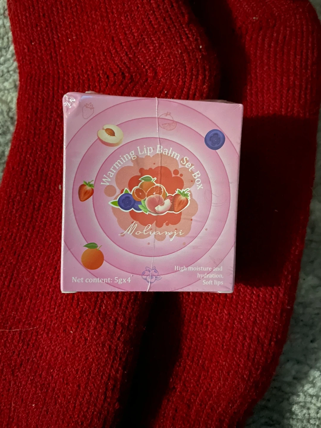 This set includes a Moliahnji Warming Lip Balm Set Box, featuring high moisture and soft lips. Also included are a pair of red, cozy socks. Perfect for keeping your lips and feet warm!