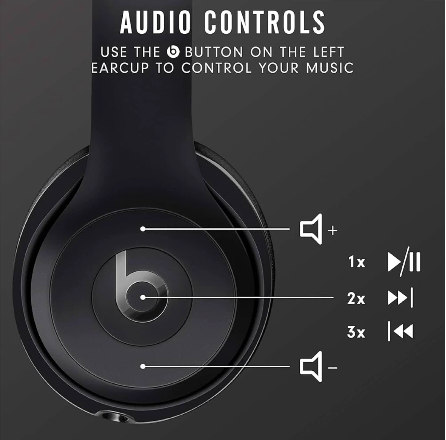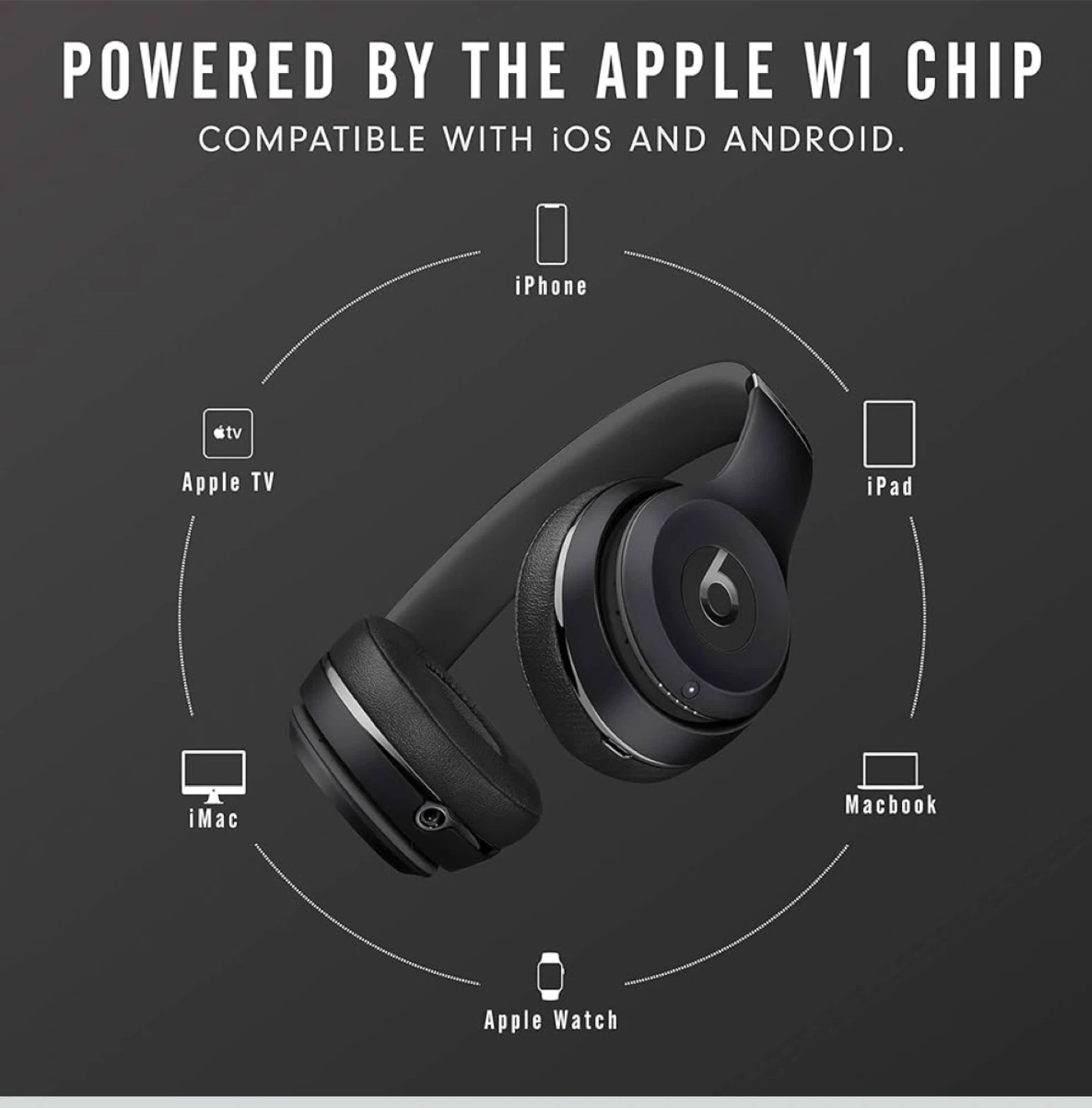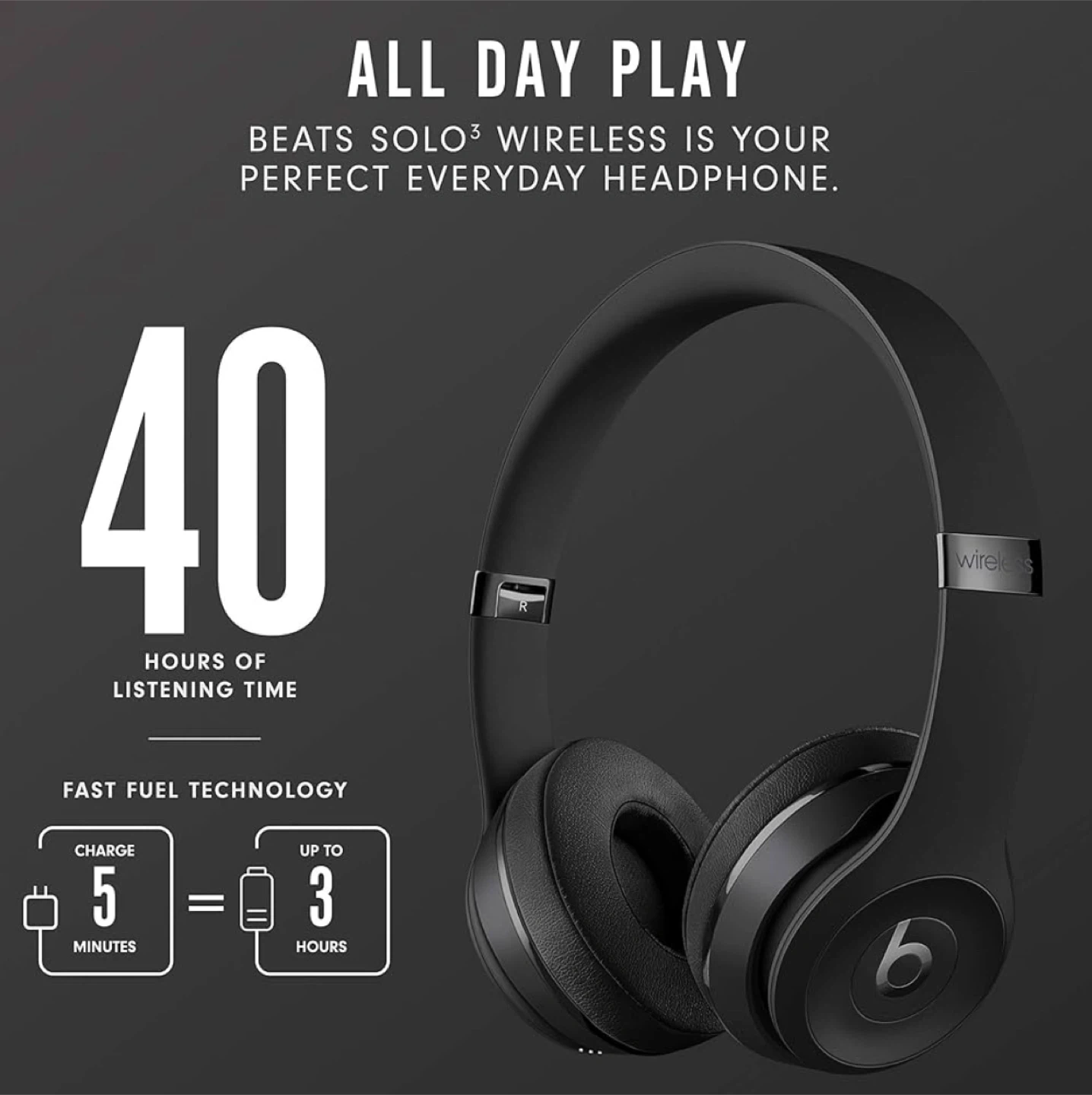 Beats Solo3 Wireless on-ear headphones in black. Offers up to 40 hours of battery life. Comes with a carrying case and original box.