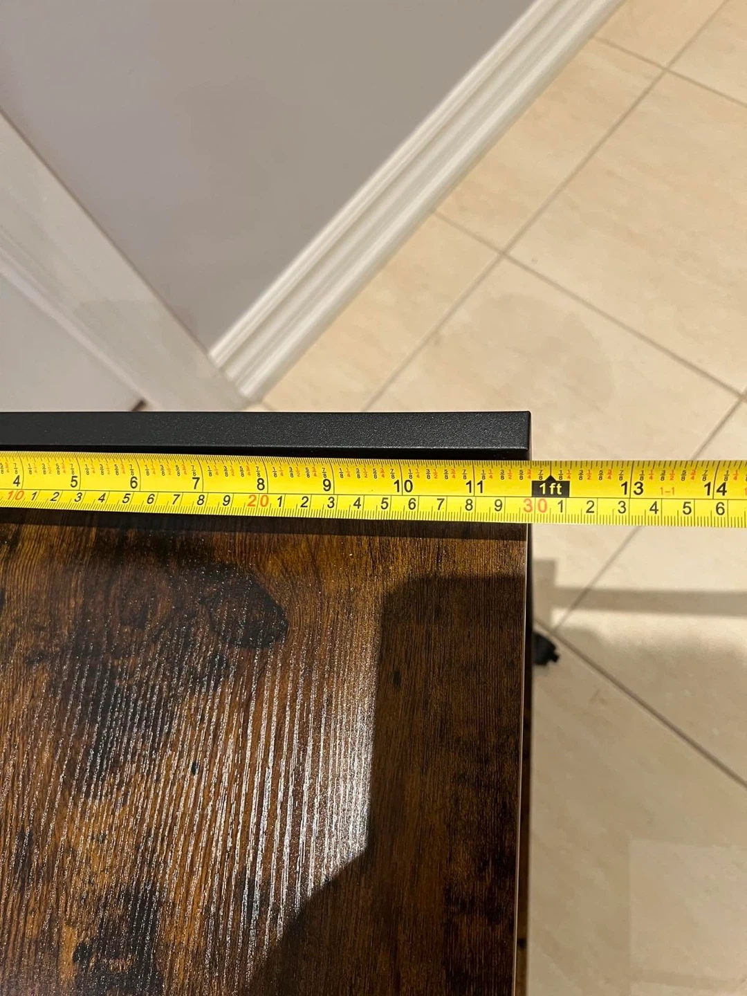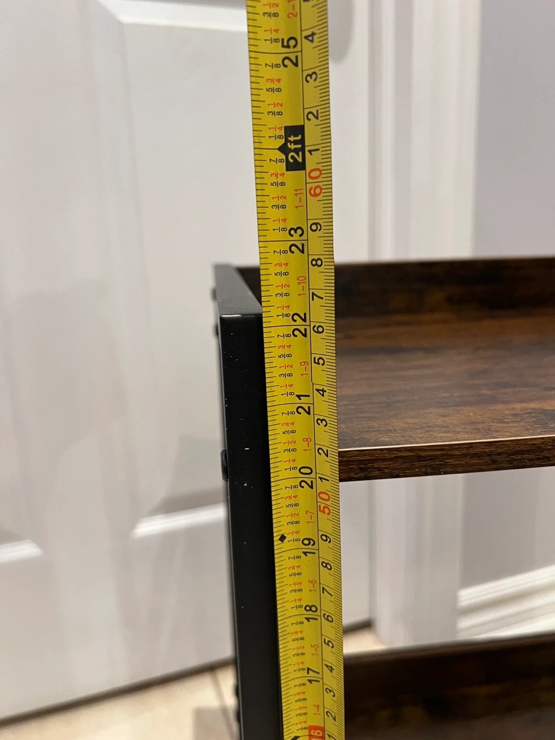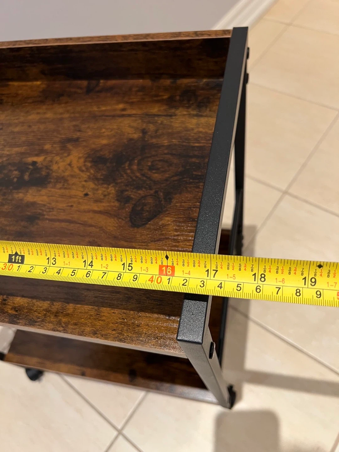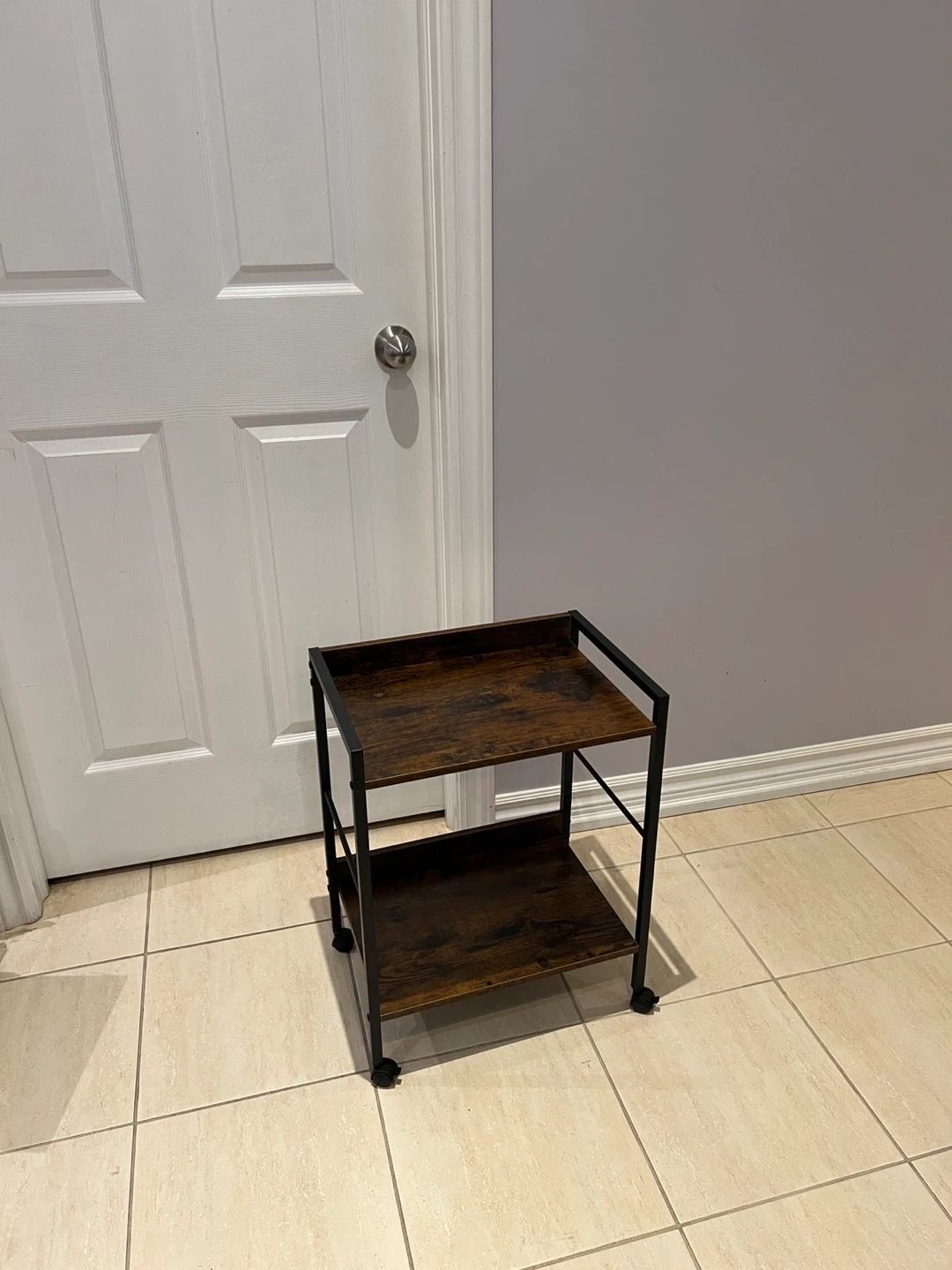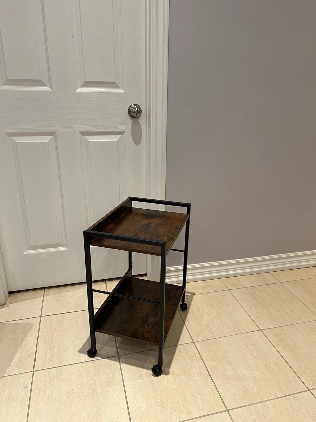 This rolling cart has a wood finish and two shelves. It's on wheels for easy movement. The cart is approximately 24 inches tall. It's useful for organizing small spaces or as a serving cart.