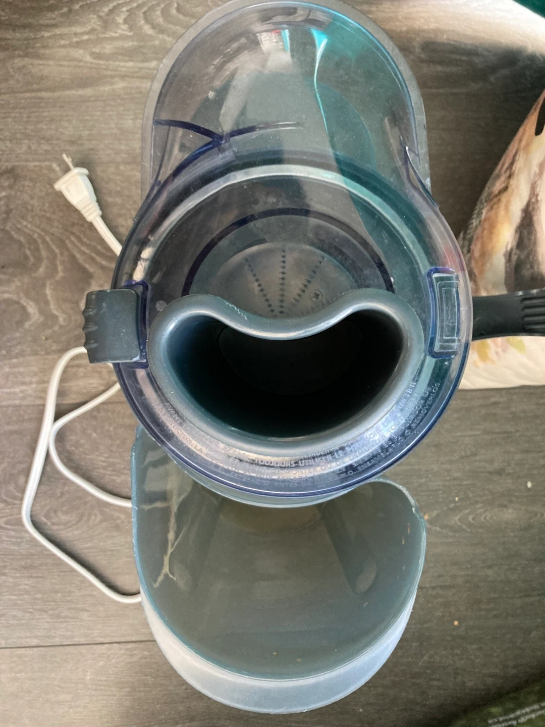 It is all washed and clean. Oster juicer, white and clear plastic. Includes pulp collector and juice pitcher.
