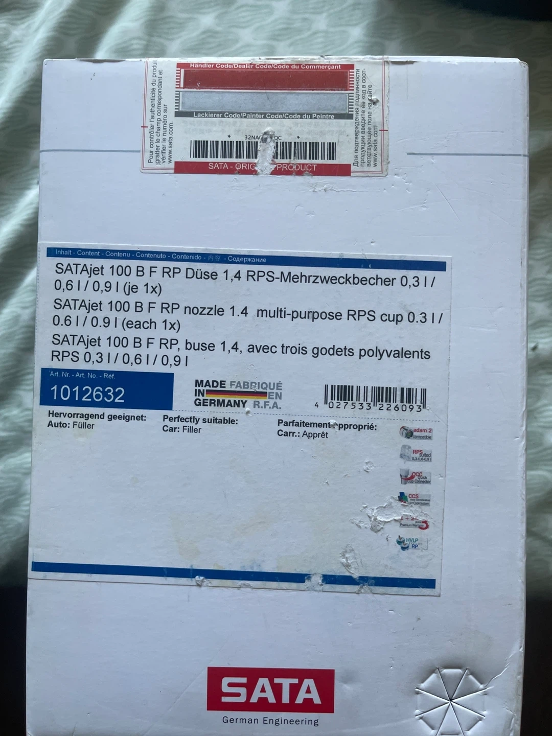 This is a SATA Jet 100 B F RP spray gun with a 0.3 I / 0.6 I / 0.9 I RPS multi-purpose cup. It's made in Germany by SATA. The cup size is 0.3, 0.6, or 0.9 L and it comes with three polyvalent godets.