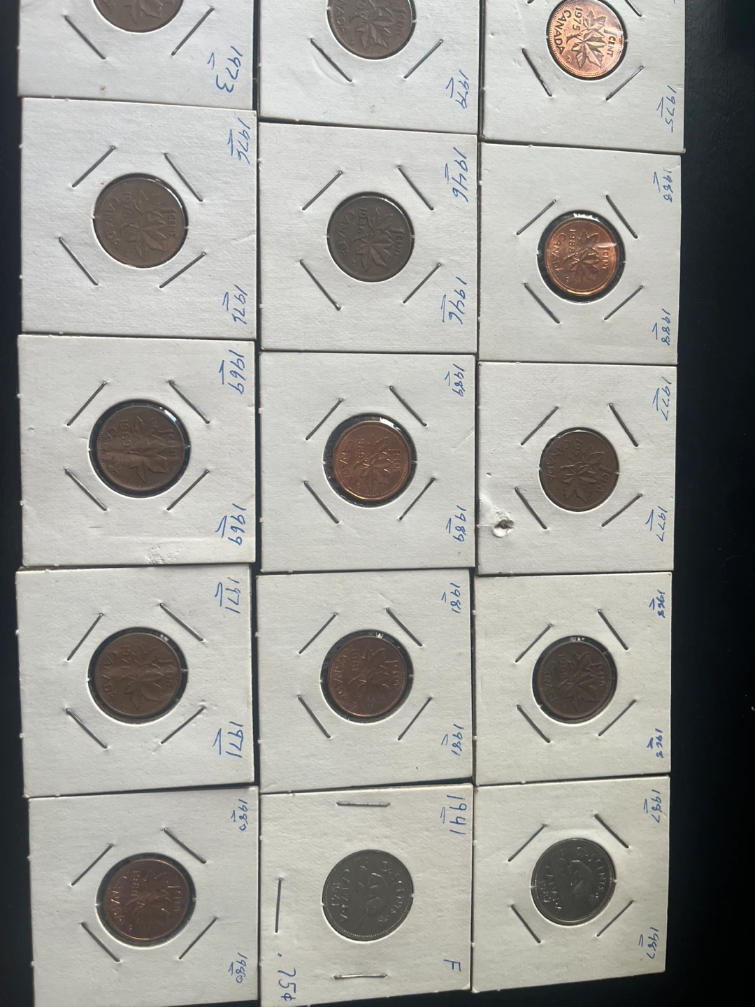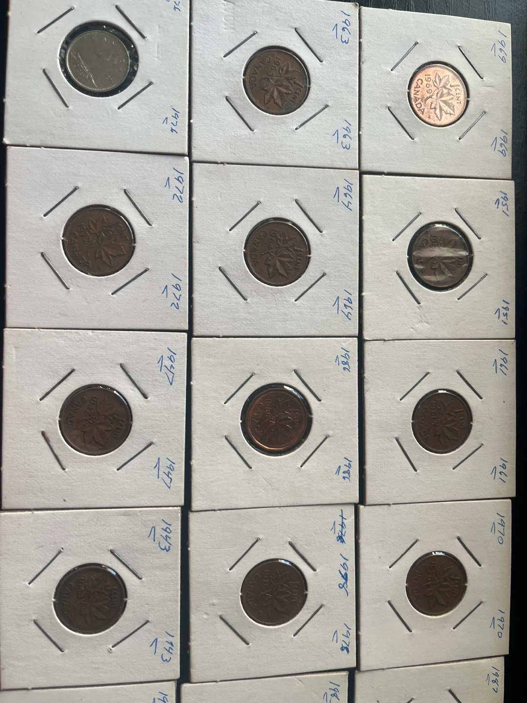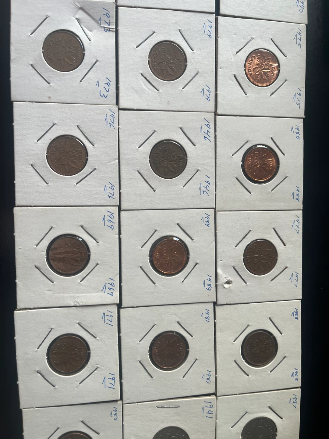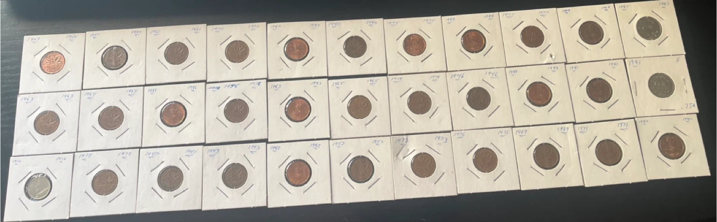 Assorted Canadian pennies from various years, including some from the 1960s, 70s, 80s, and 90s. Each coin is housed in its own protective sleeve with the year clearly marked. Great for collectors or for teaching about Canadian currency history!