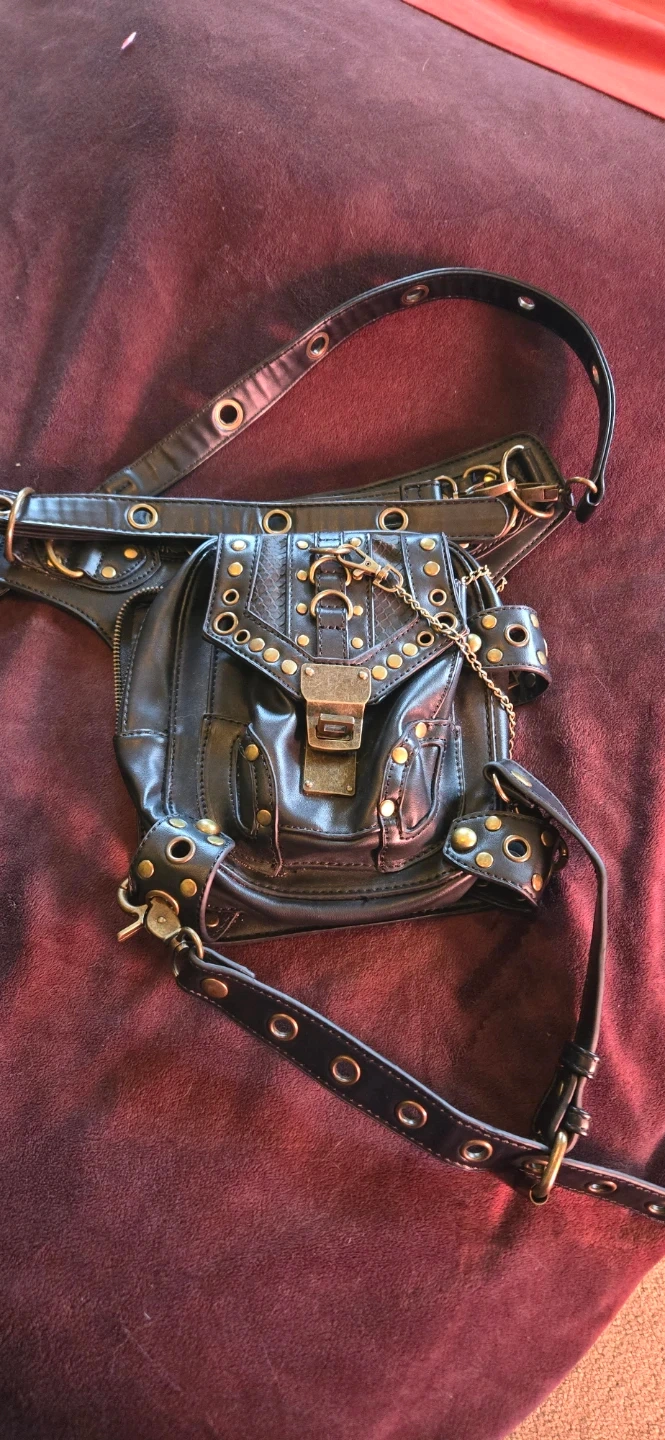 This black faux leather hip pouch features a riveted design with a buckle closure. It has multiple pockets and a chain accent. The adjustable strap has multiple eyelets for a custom fit. Great for festivals or everyday carry!