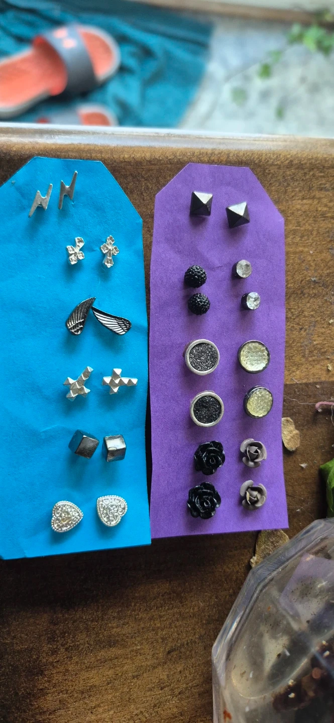A collection of unique stud earrings for everyday wear. Includes lightning bolts, crosses, wings, geometric shapes, hearts, studs, and rose designs. Some earrings feature glitter or stone accents. Great for adding a personal touch to any outfit!