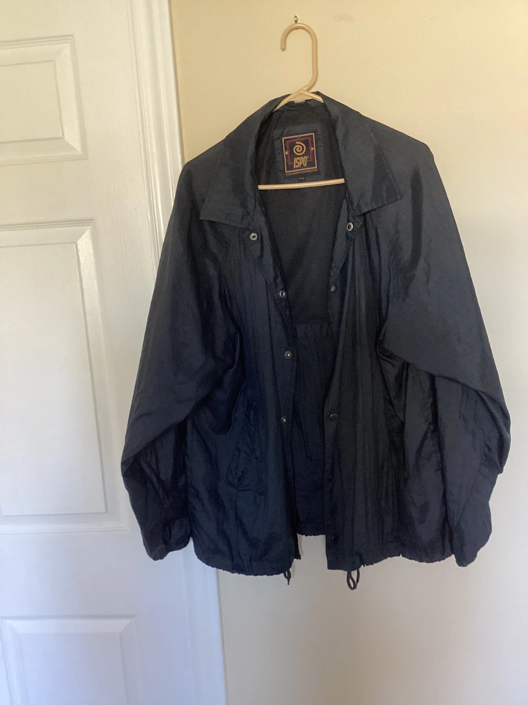 This ISPO black jacket is a size L/G. It is like new never wore. It's made of a lightweight, possibly nylon material with a mesh lining. Features snap button closure and a drawstring hem. Perfect for casual wear or light outdoor activities.clean environment no smoking no pet.