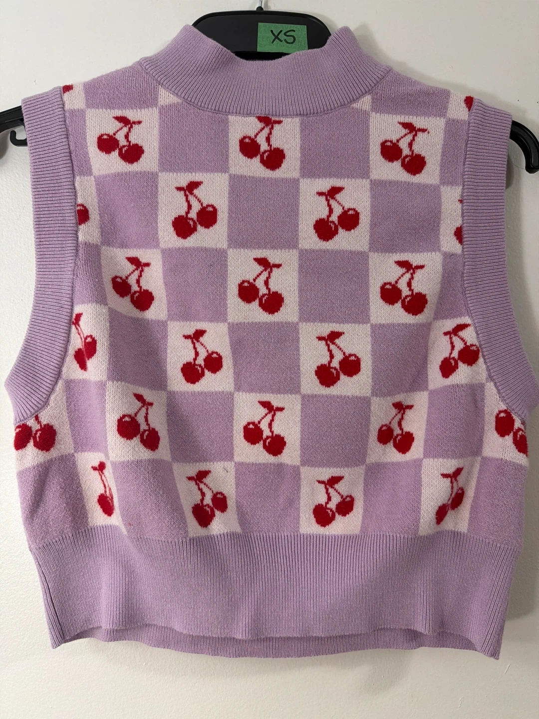 This sleeveless sweater vest features a playful cherry checkered pattern on a lavender background. It's designed with a mock neck and ribbed trim. Size L.
