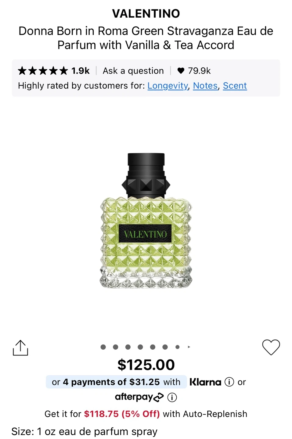 Valentino Donna Born in Roma Green Stravaganza Eau de Parfum. This fragrance features a vanilla & tea accord. Size is 1 oz.