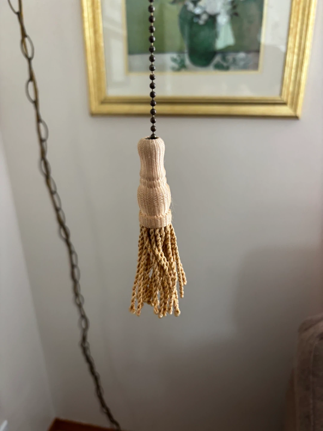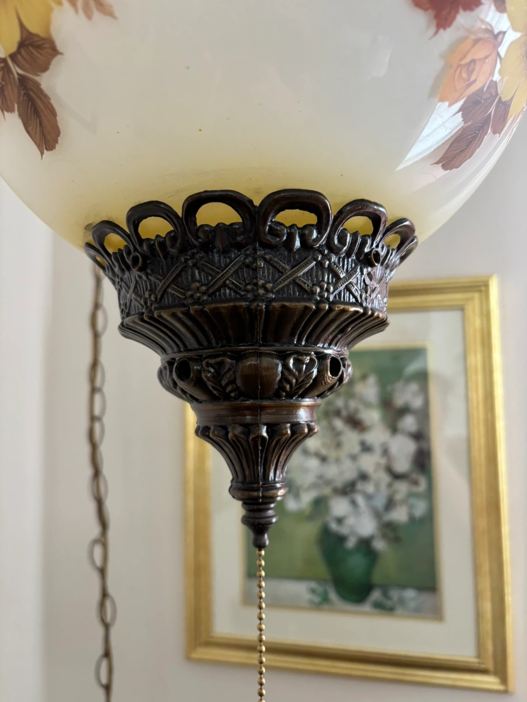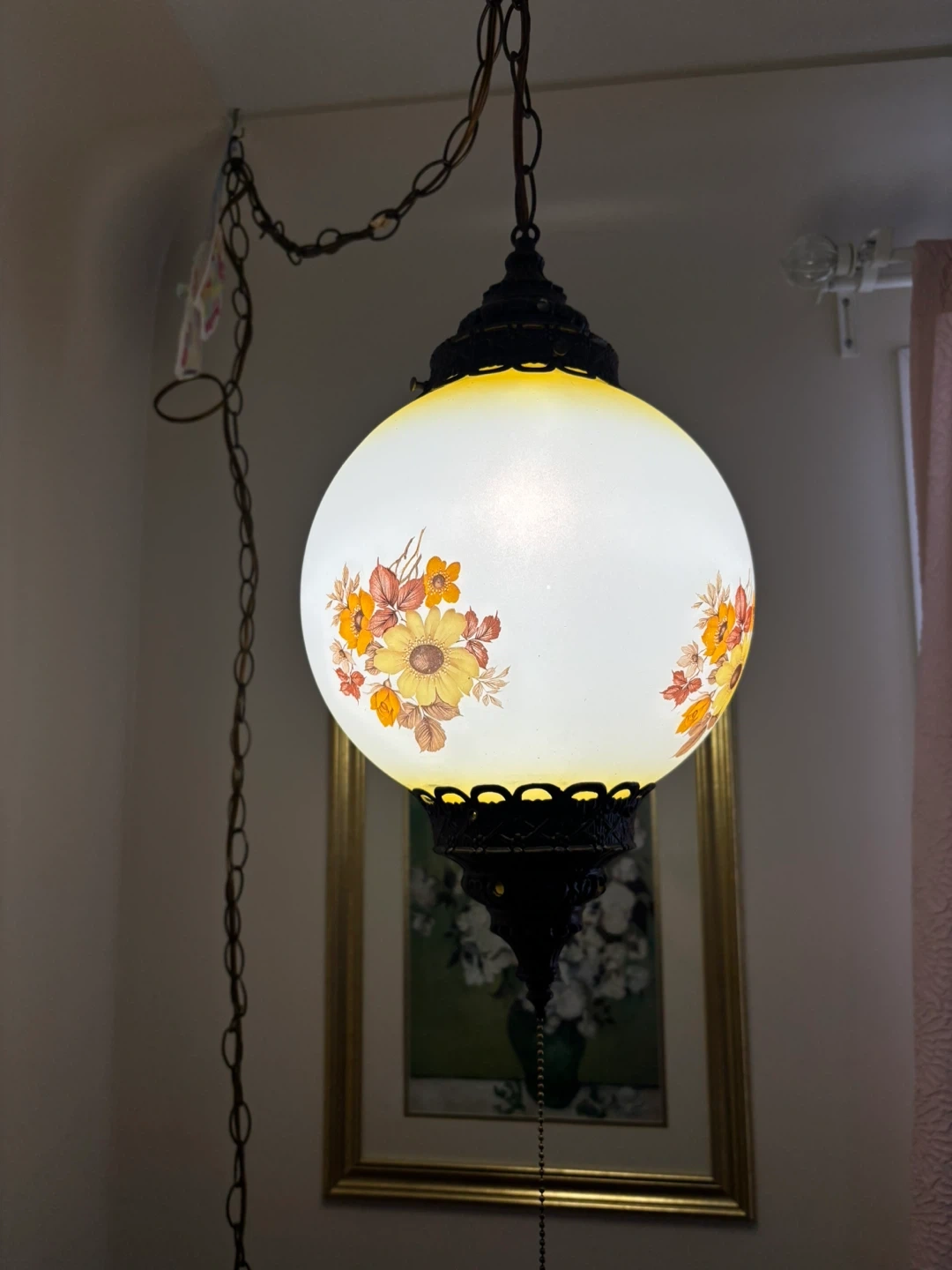 This vintage hanging globe lamp features a frosted glass shade adorned with a beautiful floral pattern in yellow, orange, and brown tones. It has ornate metal accents and a pull chain for operation. It's a lovely piece that adds a touch of retro charm to any room!