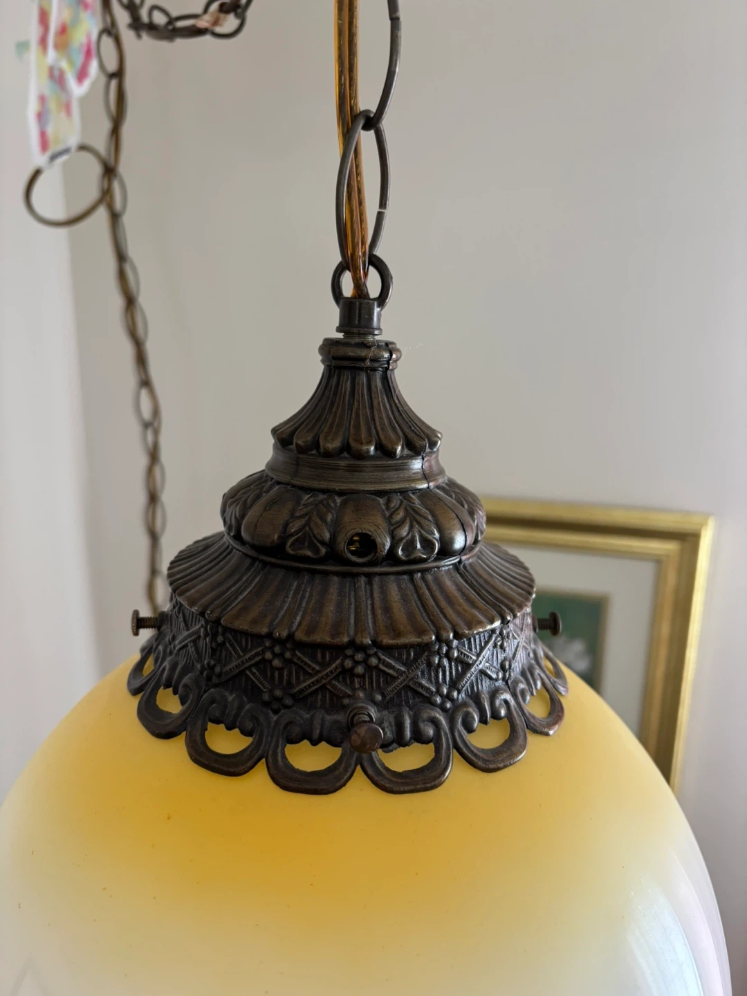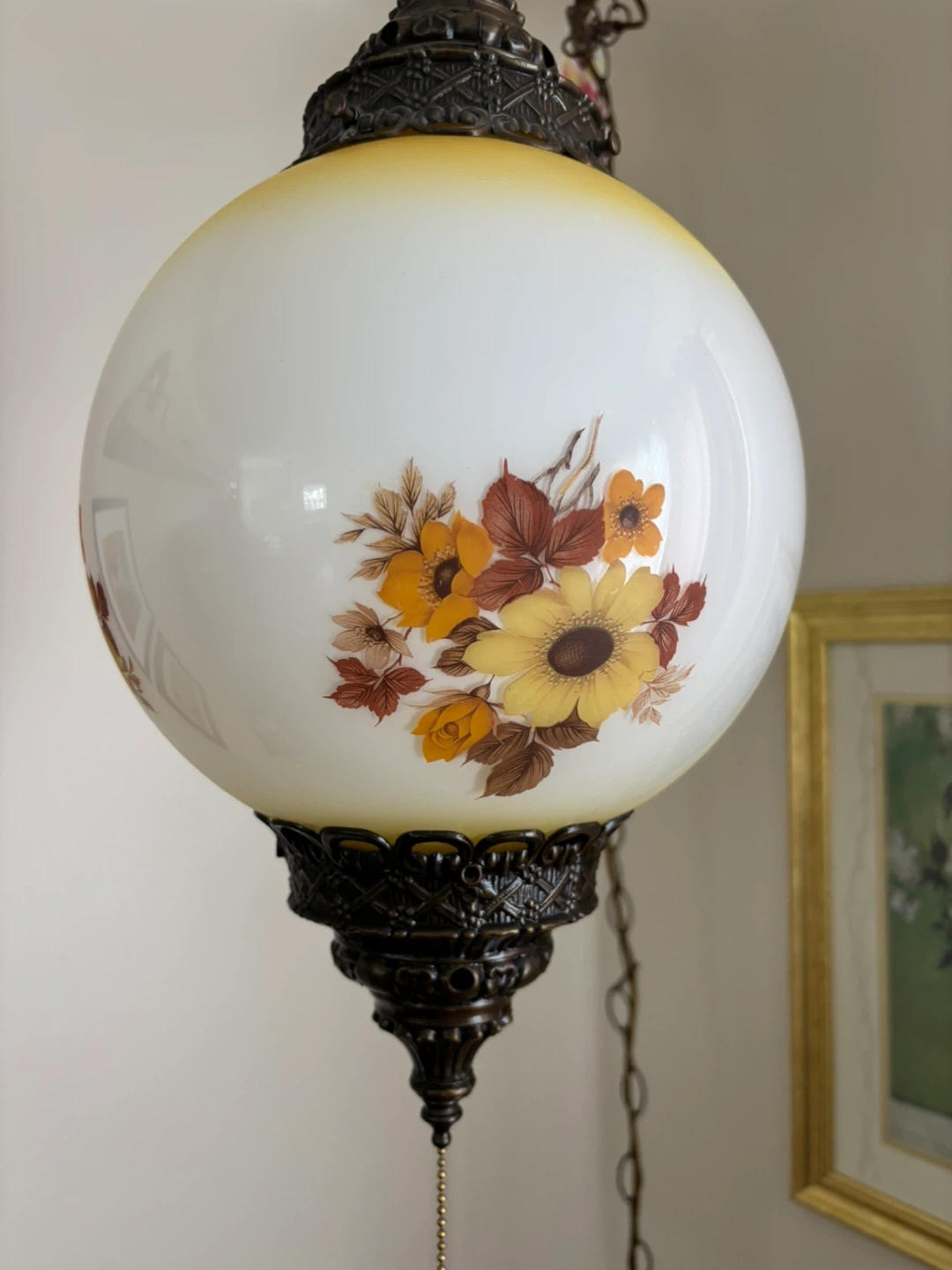 This vintage hanging globe lamp features a frosted glass shade adorned with a beautiful floral pattern in yellow, orange, and brown tones. It has ornate metal accents and a pull chain for operation. It's a lovely piece that adds a touch of retro charm to any room!