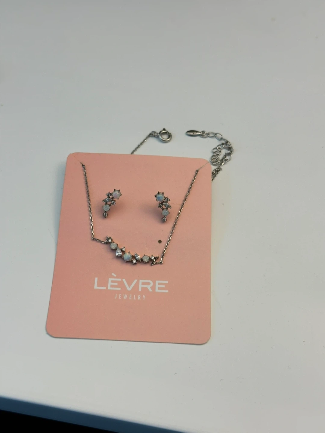 This is a Lèvre Jewelry necklace and matching earrings set. The jewelry features a silver-tone metal and small white stones. It comes on a pink display card.