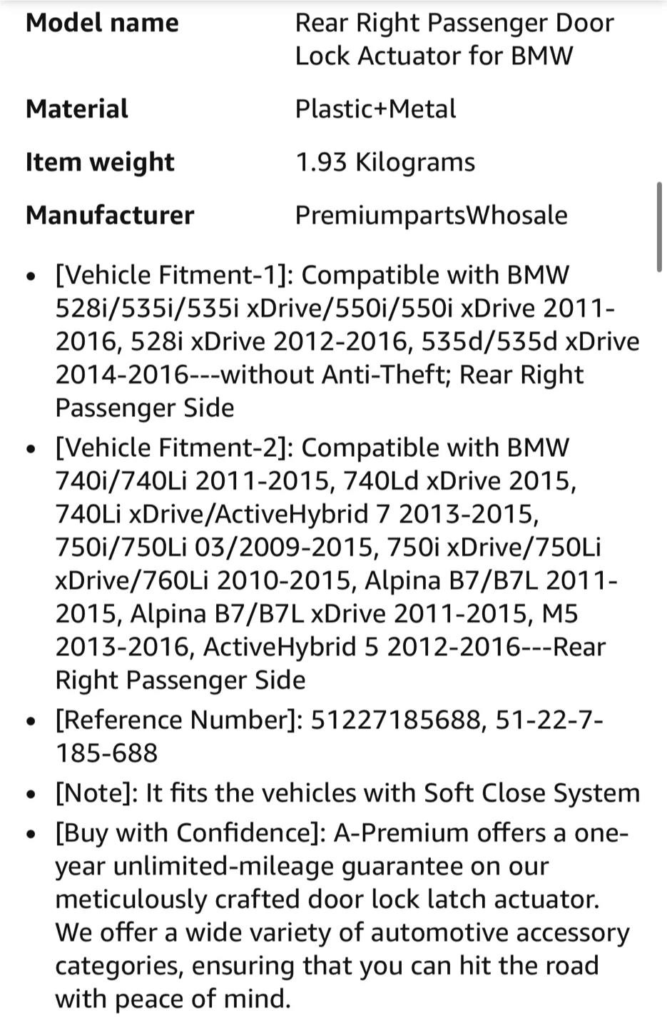 This is a rear right passenger door lock actuator assembly for BMW vehicles. It's made from plastic and metal components. This part fits BMW models with a soft-close system.
