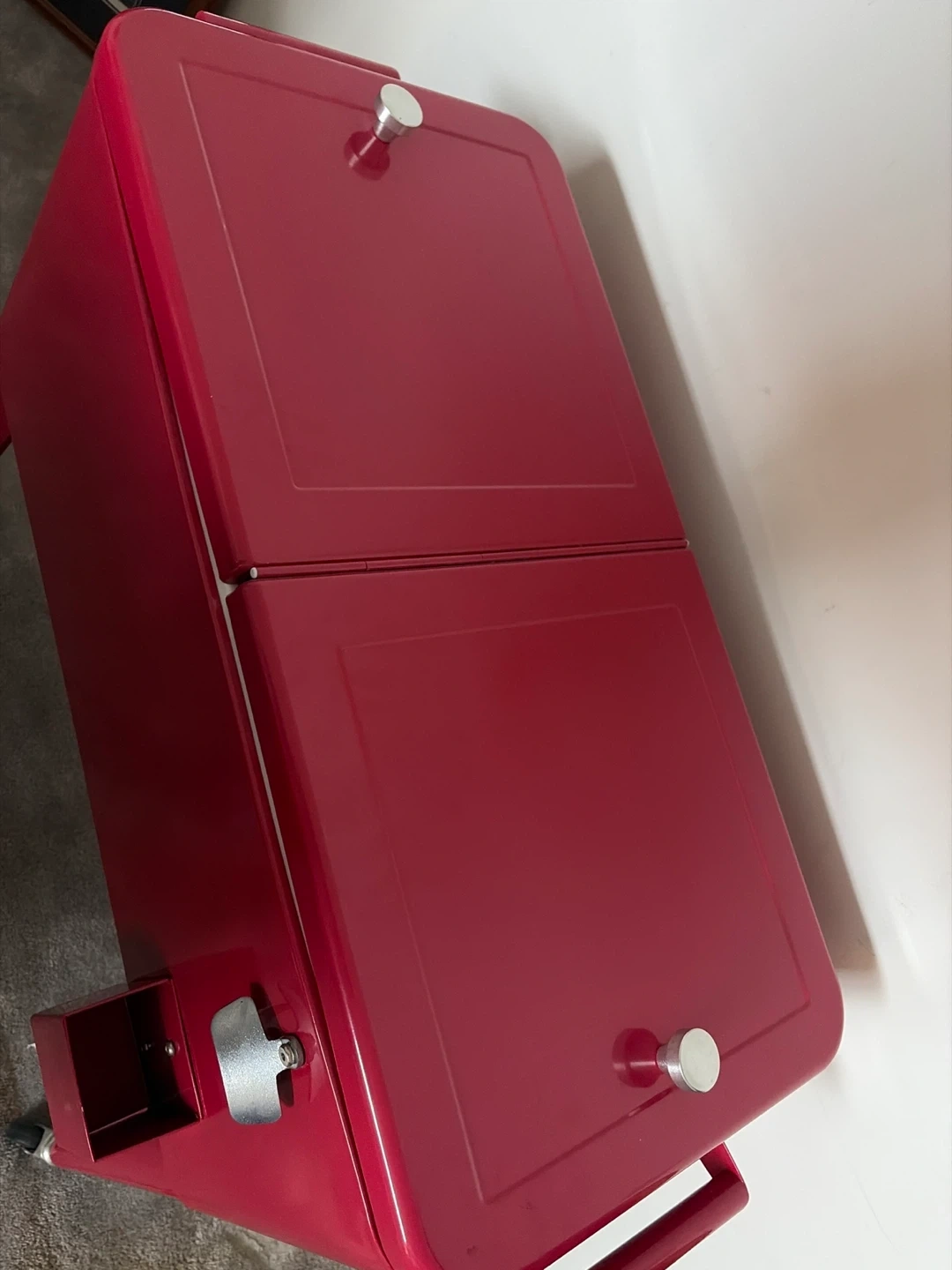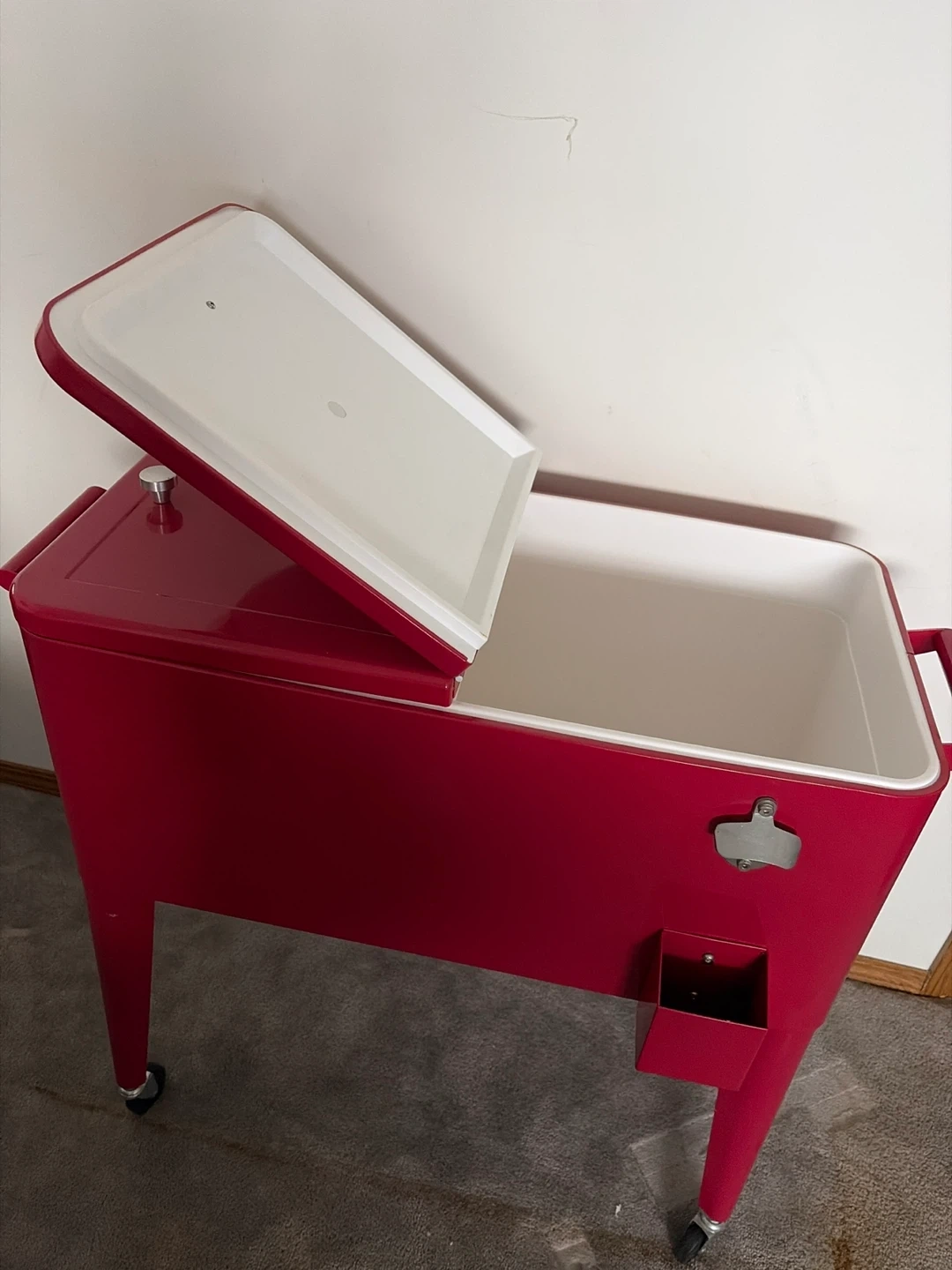 This red rolling cooler cart is perfect for backyard BBQs and parties. It's got a built-in bottle opener and a removable lid. The caster wheels make it easy to move around. It's great for keeping drinks chilled on hot summer days!