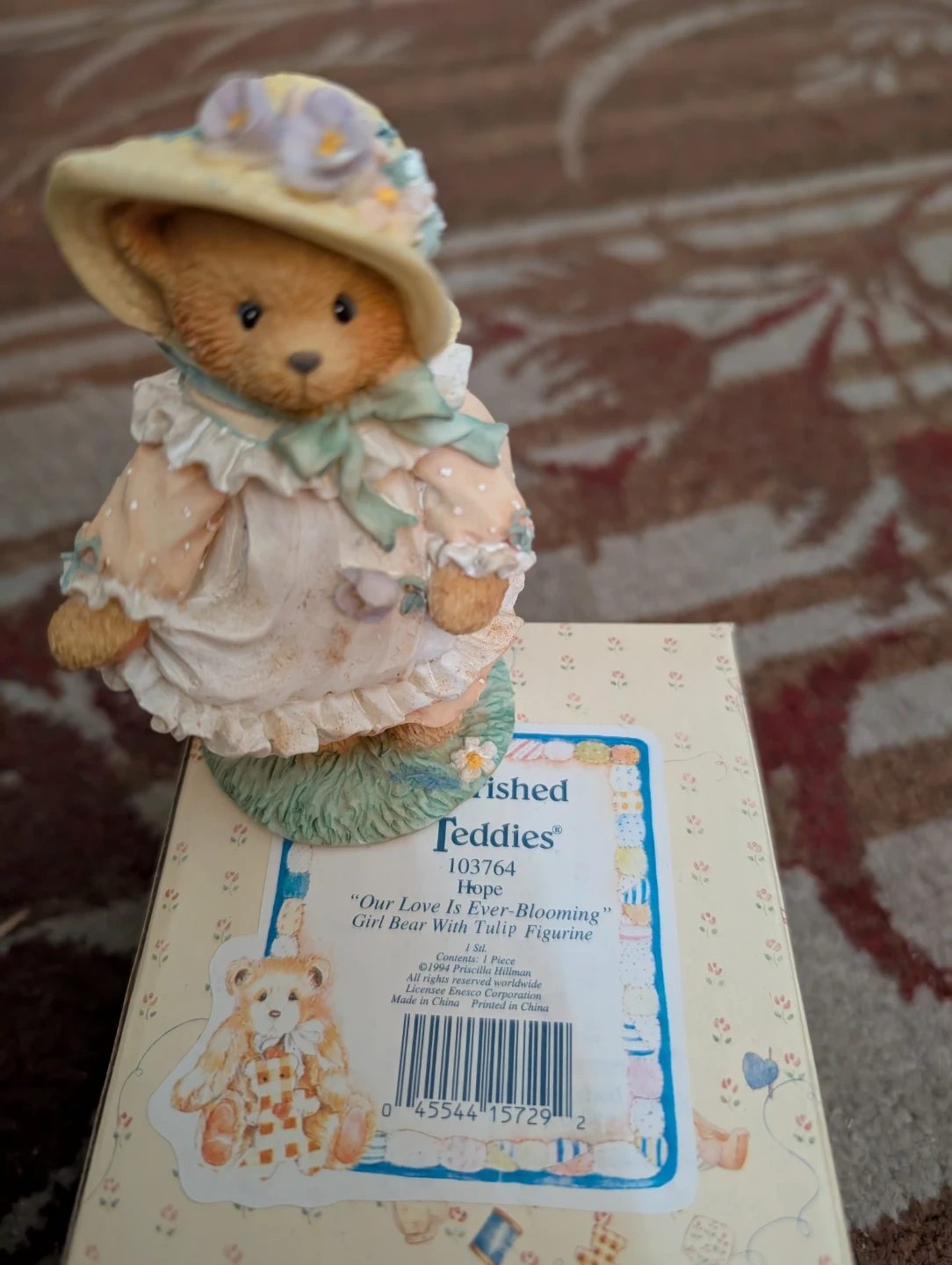 This is the Hope "Our Love Is Ever-Blooming" Girl Bear With Tulip Figurine. It's a collectible piece from 1994. This figurine is made in China.