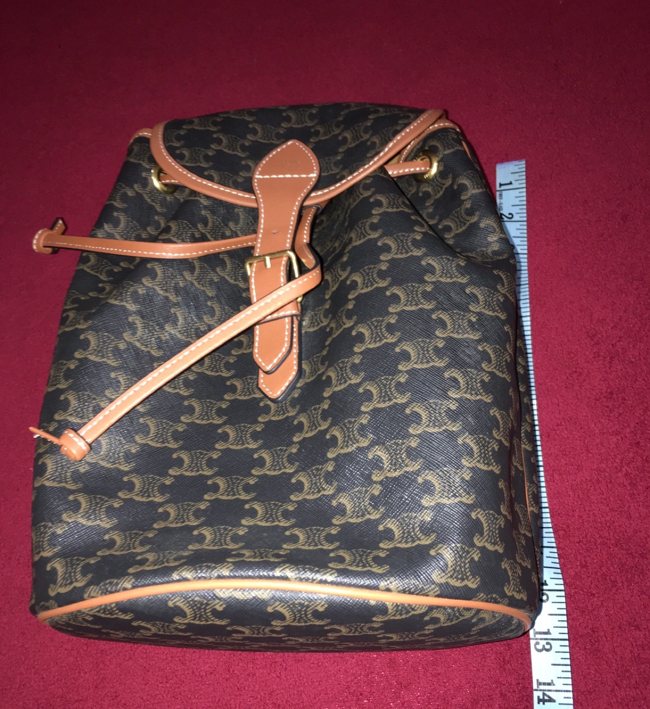 This Celine backpack features the classic Triomphe canvas pattern with tan leather trim. It has adjustable shoulder straps and a drawstring closure with a buckle flap. The dimensions are approximately 11 inches high by 9 inches wide.