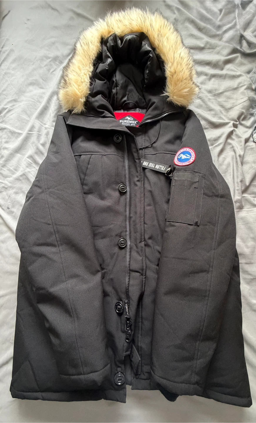 This black parka jacket is from PUREMSX. It features a faux fur-lined hood and a durable exterior perfect for colder weather. Multiple pockets offer convenient storage.