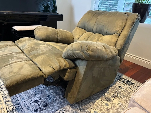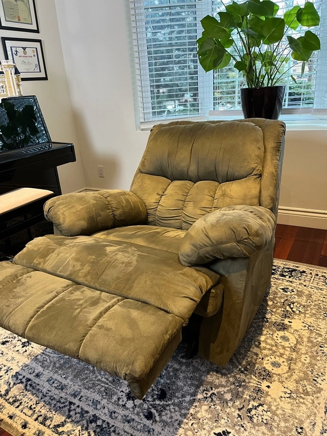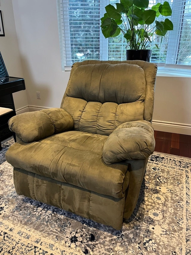 Relax in ultimate comfort with this plush, olive green recliner, perfect for any living space. As a used item, it shows signs of love but is still in great working condition. This cozy chair is ready to be the highlight of your relaxation routine. While I don't have a list of specific dimensions for this chair, it's generously sized for comfortable lounging. Comparable recliners can be found on Kijiji for around $150 - $400, so I have priced mine competitively, with a bit of wiggle room. If the ad is up, it's available! Don't miss the chance to add this comfy recliner to your home. Condition: Used - Good. For Sale By: Owner. Payment: Cash accepted.