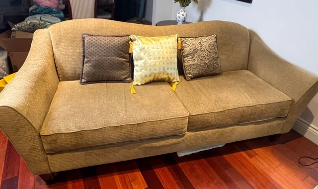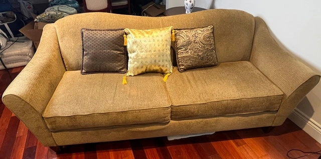 This used sofa, featuring a classic design, is ready to bring warmth and character to your living space. It’s perfect for cozying up with a book or enjoying movie nights. While it shows some signs of wear, it remains sturdy and comfortable, offering great value for its next home. If you're seeing this ad, the sofa is still up for grabs! Cash accepted.