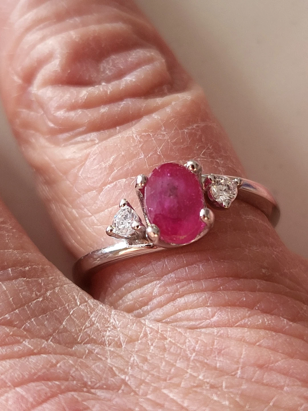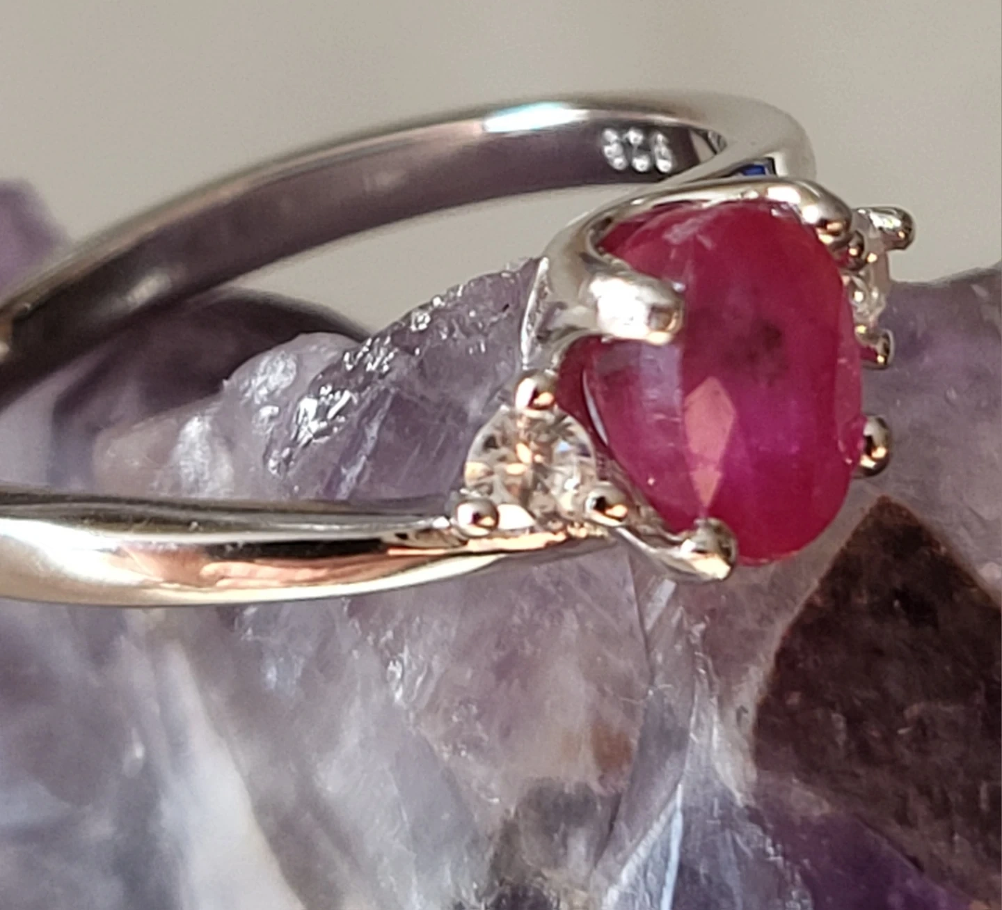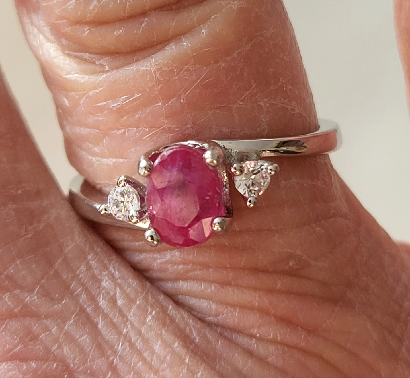 This ring features an oval-cut ruby center stone, flanked by two smaller accent stones. It's crafted from sterling silver. The band has a delicate twist design. This piece would make a lovely addition to any jewelry collection!