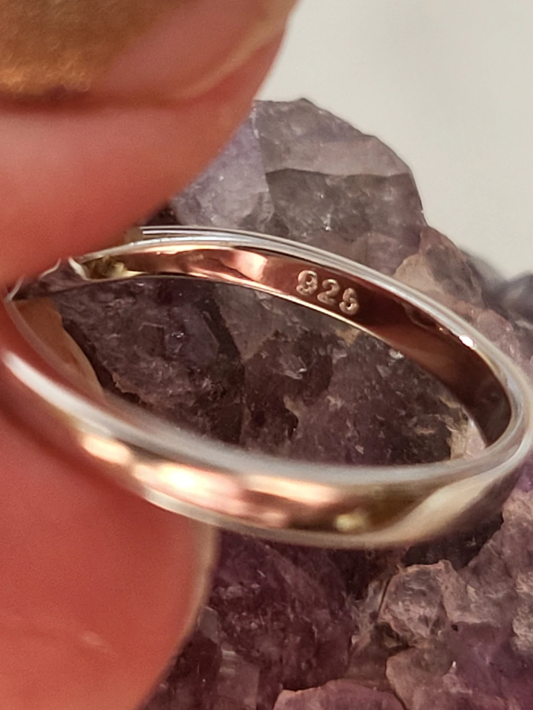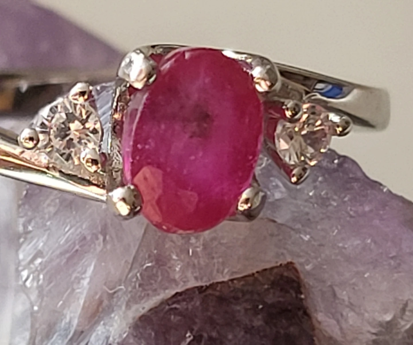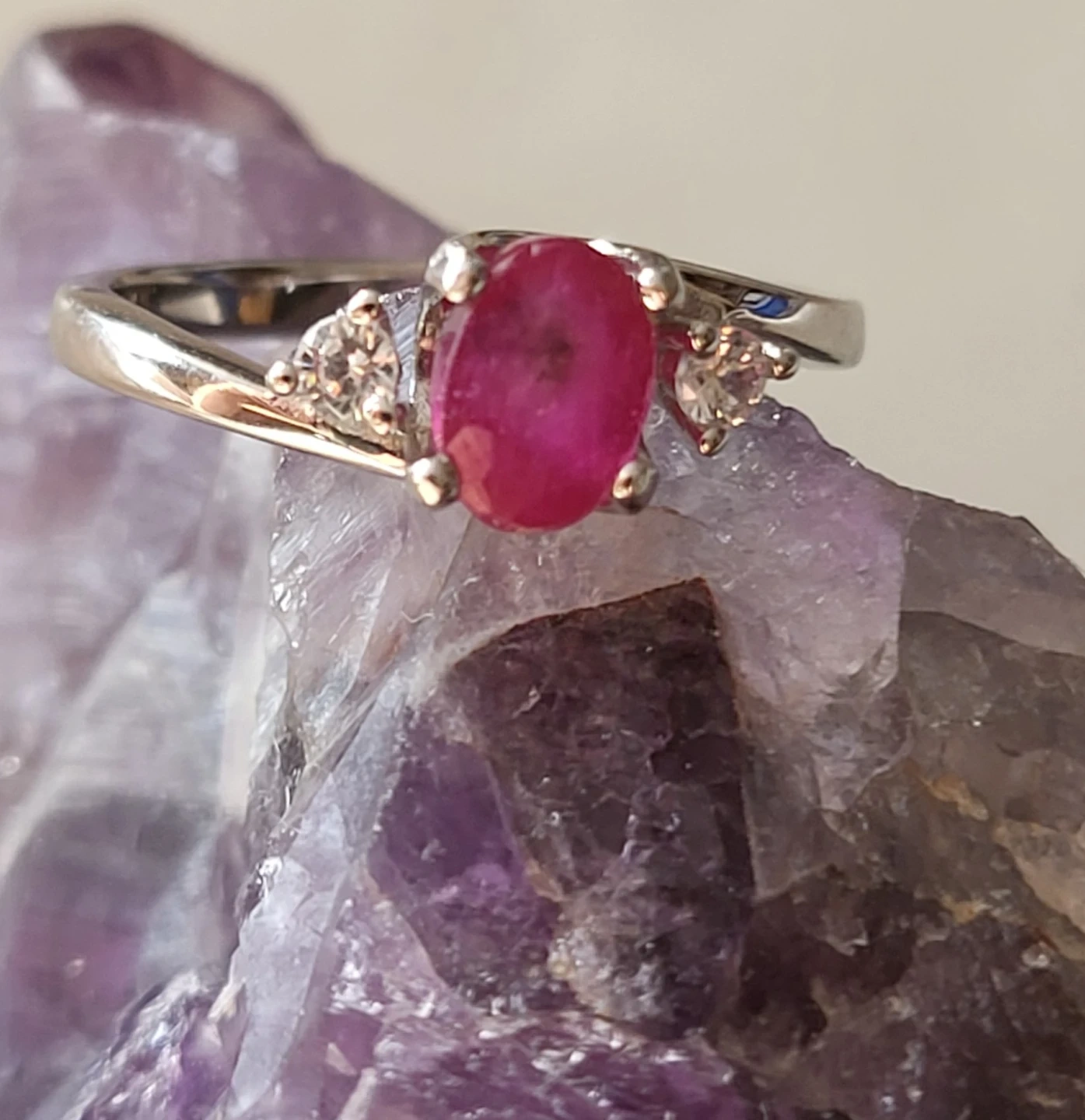 This ring features an oval-cut ruby center stone, flanked by two smaller accent stones. It's crafted from sterling silver. The band has a delicate twist design. This piece would make a lovely addition to any jewelry collection!