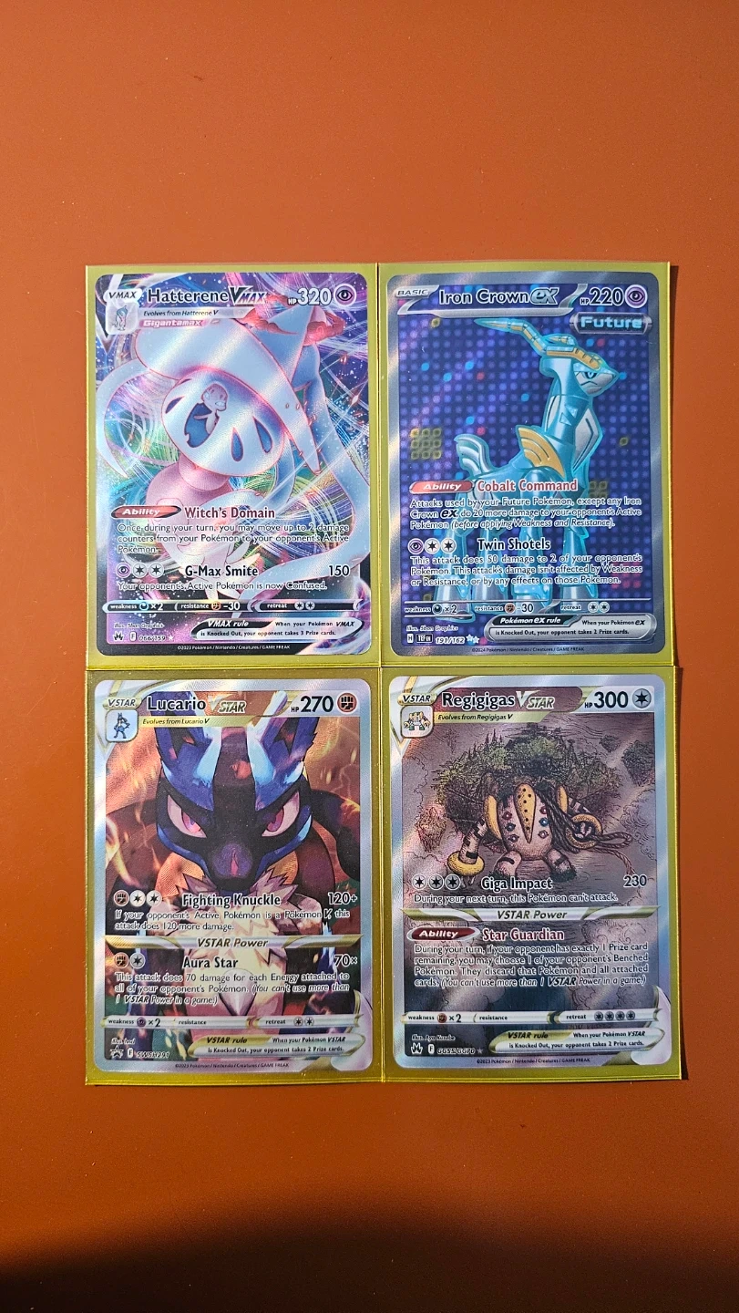 Lot of four Pokemon trading cards including Hatterene VMAX, Iron Crown EX, Lucario VSTAR, and Regigigas VSTAR. Features VMAX, VSTAR, and EX card types.