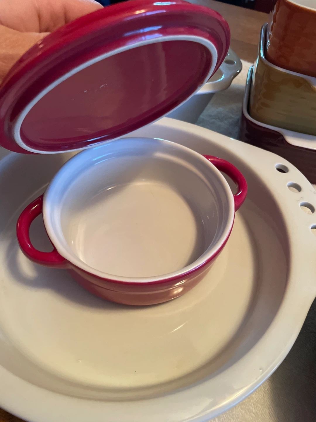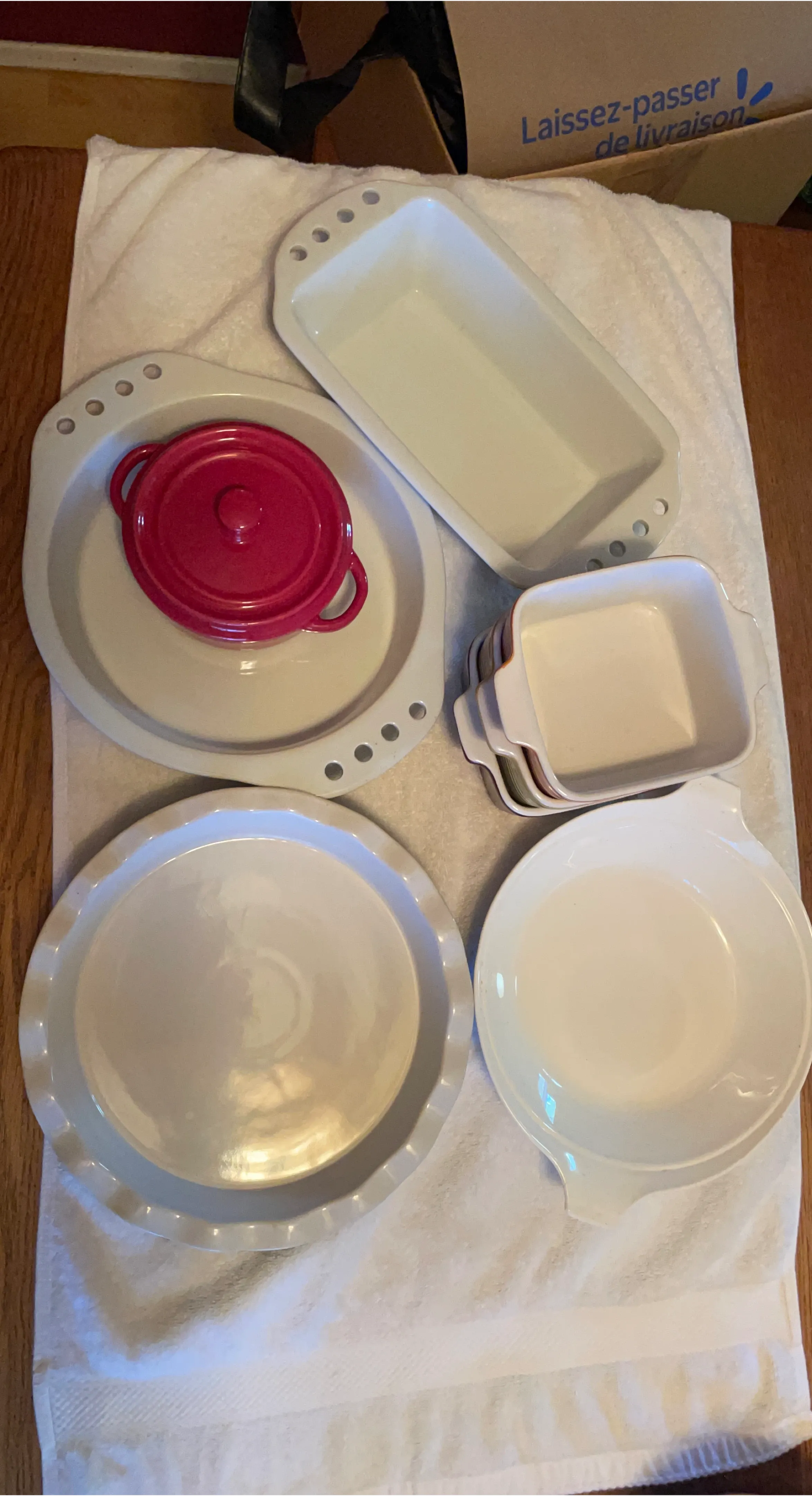 This set includes a variety of ceramic baking dishes. There's a large rectangular dish, a round pie plate, a small lidded pot, and a stack of four small ramekins in assorted colours. They're suitable for many baking needs!