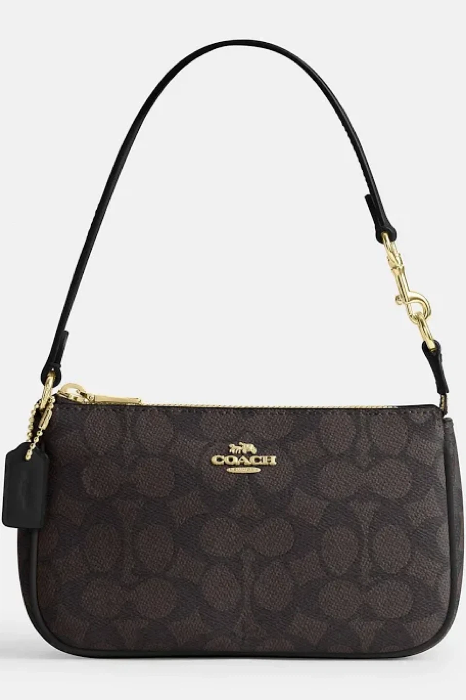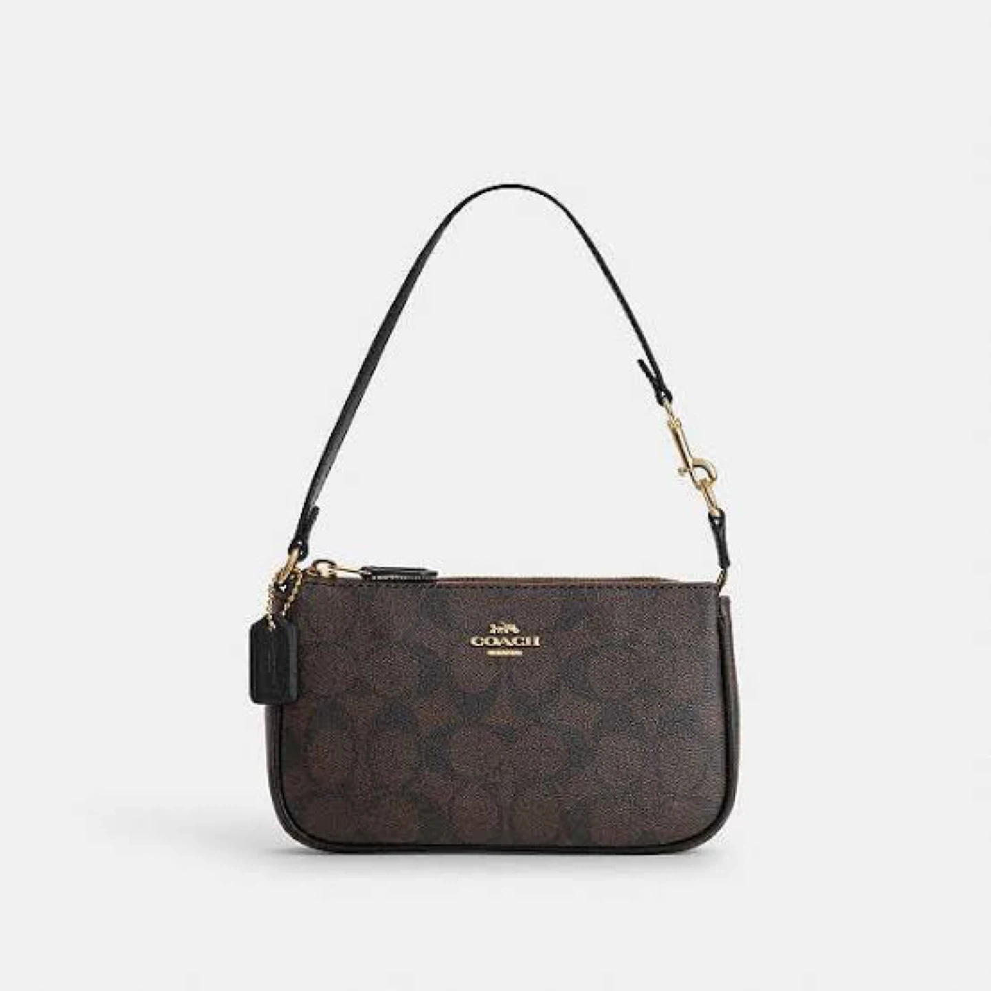 This is a Coach wristlet pouch in their signature brown print. It features a zip-top closure and a detachable wrist strap. Perfect for carrying essentials when you're on the go! UNOPENED BRAND NEW LEGIT HAVE SCREENSHOT FROM ACTUAL SITE