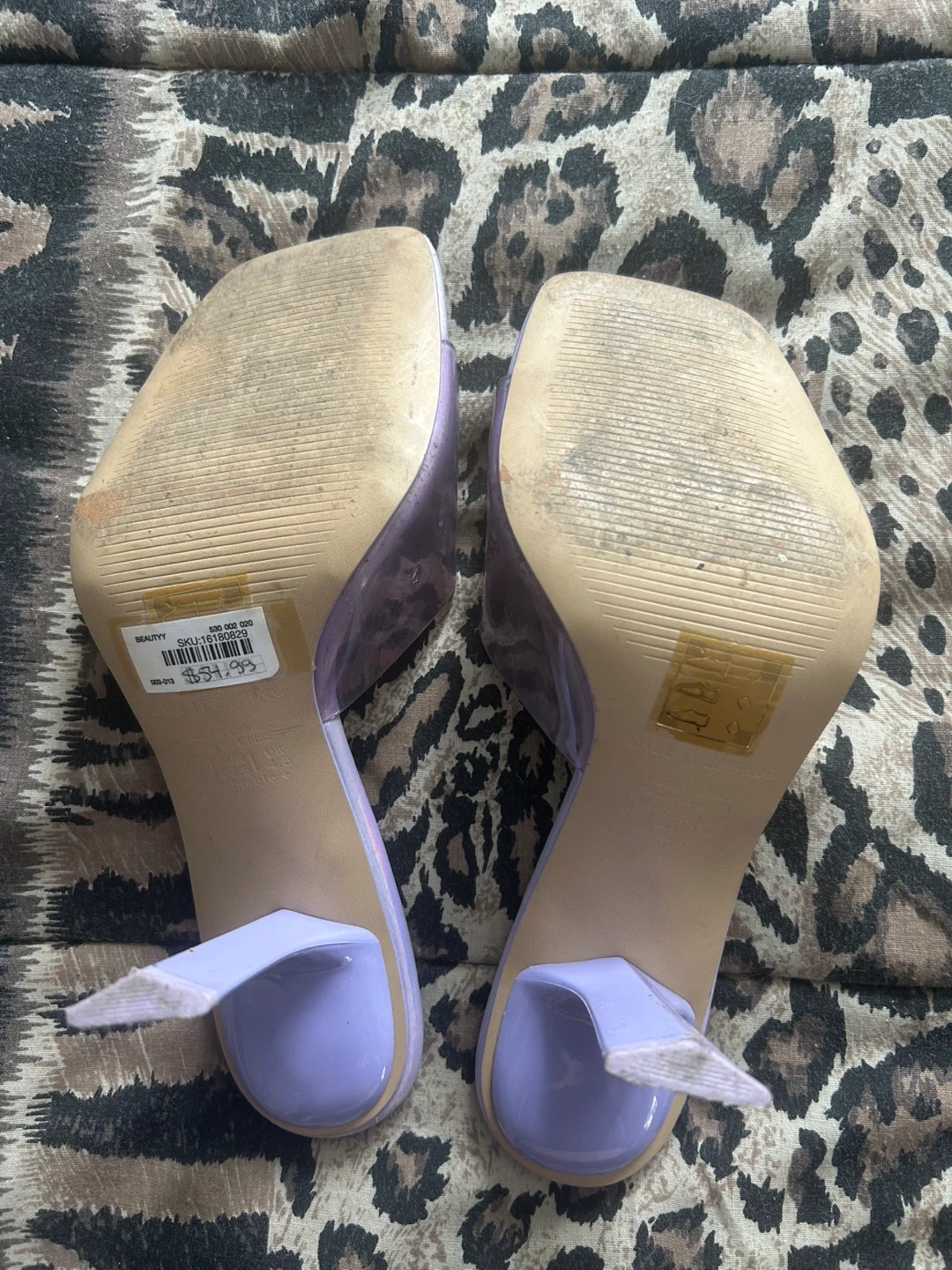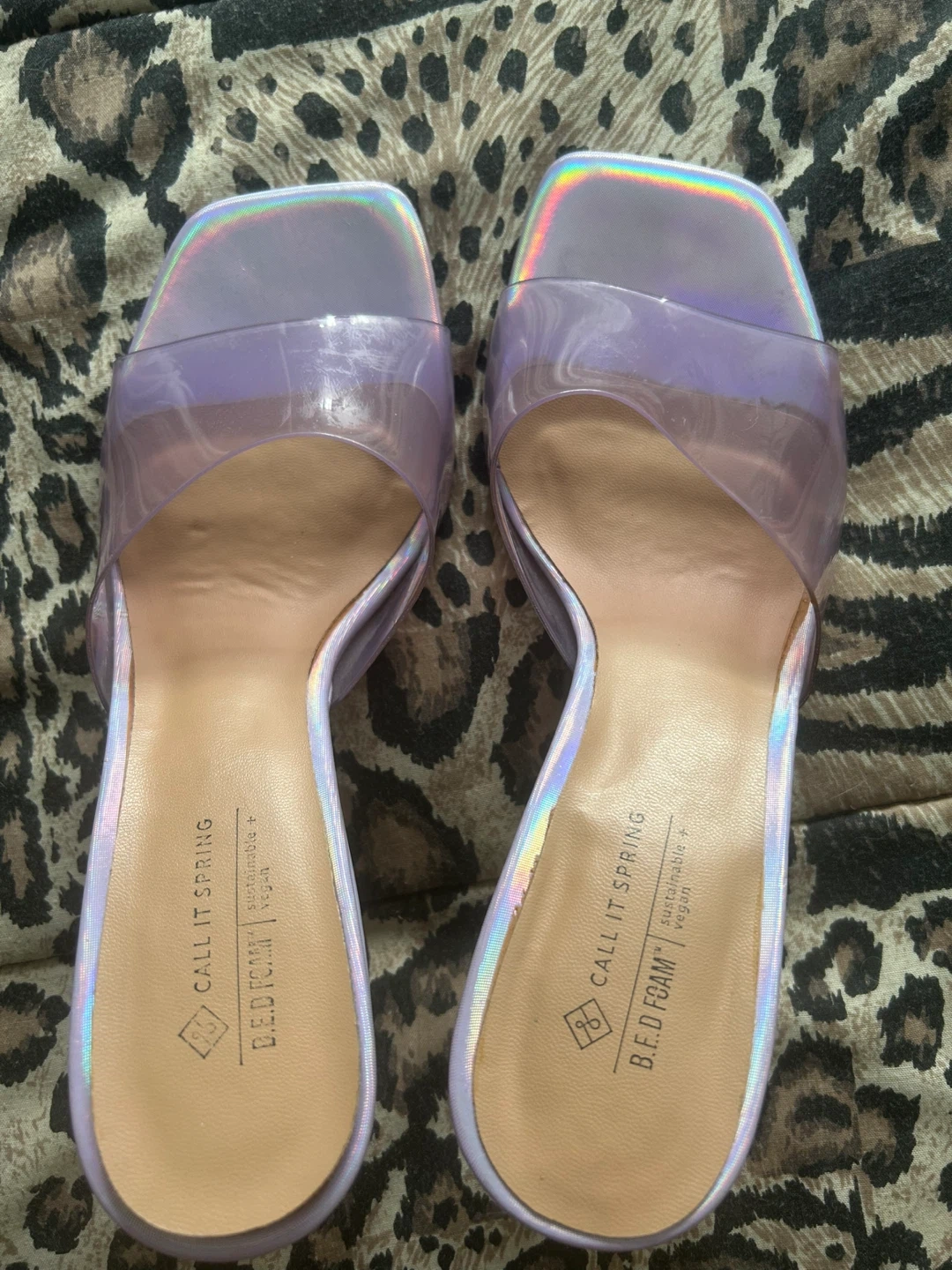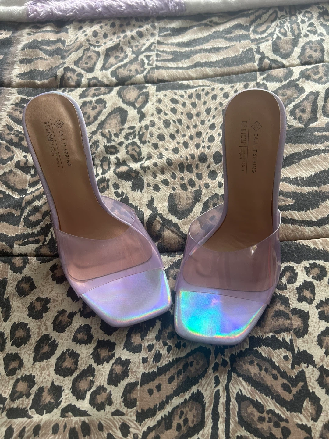 These Call It Spring heels are a stylish choice. They feature clear iridescent straps and a square toe design. The heel height appears to be around 3 inches. They're a fun addition to any outfit!
