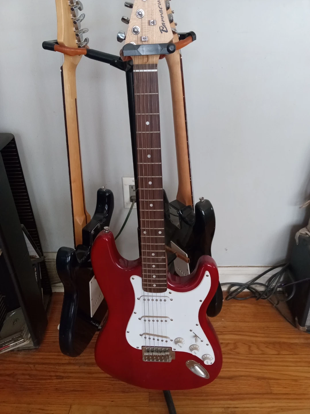 Red electric guitar by Barracuda. It has a white pickguard with three single-coil pickups. Includes volume and tone controls.