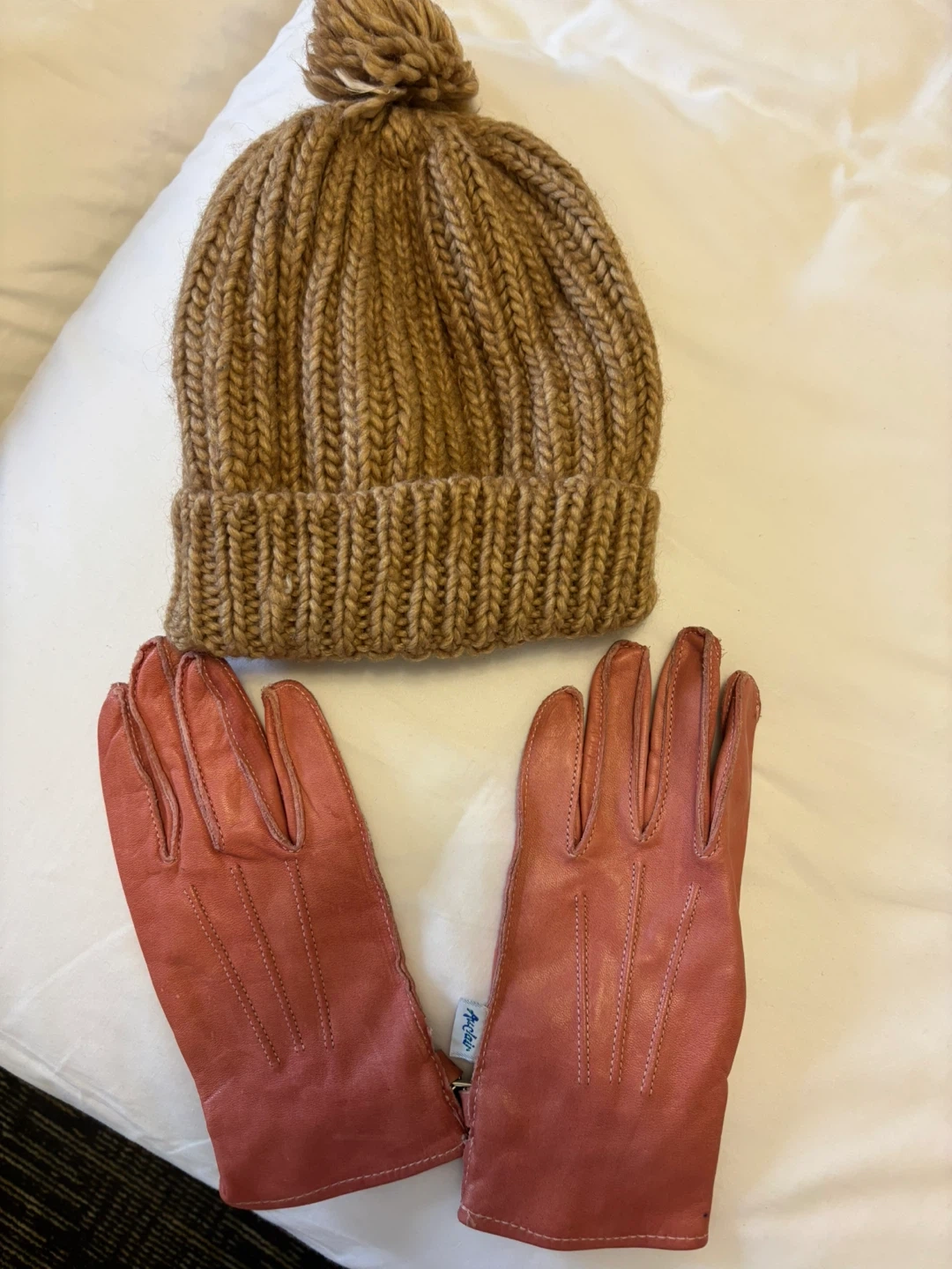 A cozy brown knit beanie with a pom-pom and a pair of pink leather gloves are included. The gloves have detailed stitching and a small tag. Perfect for keeping warm on chilly days!