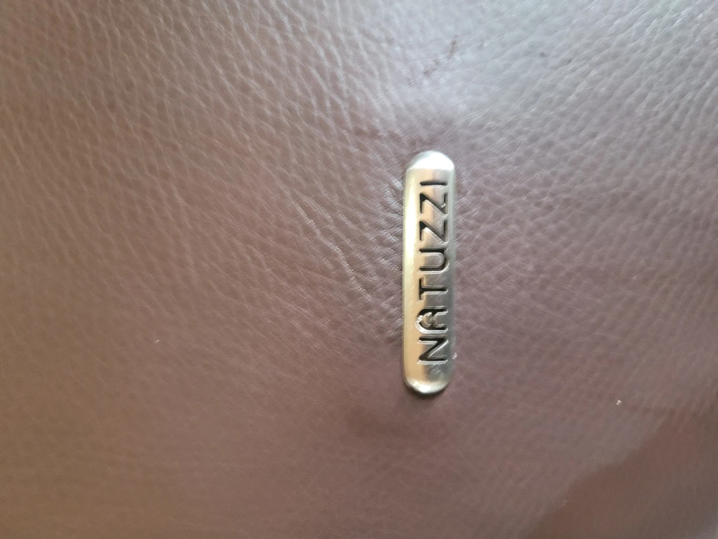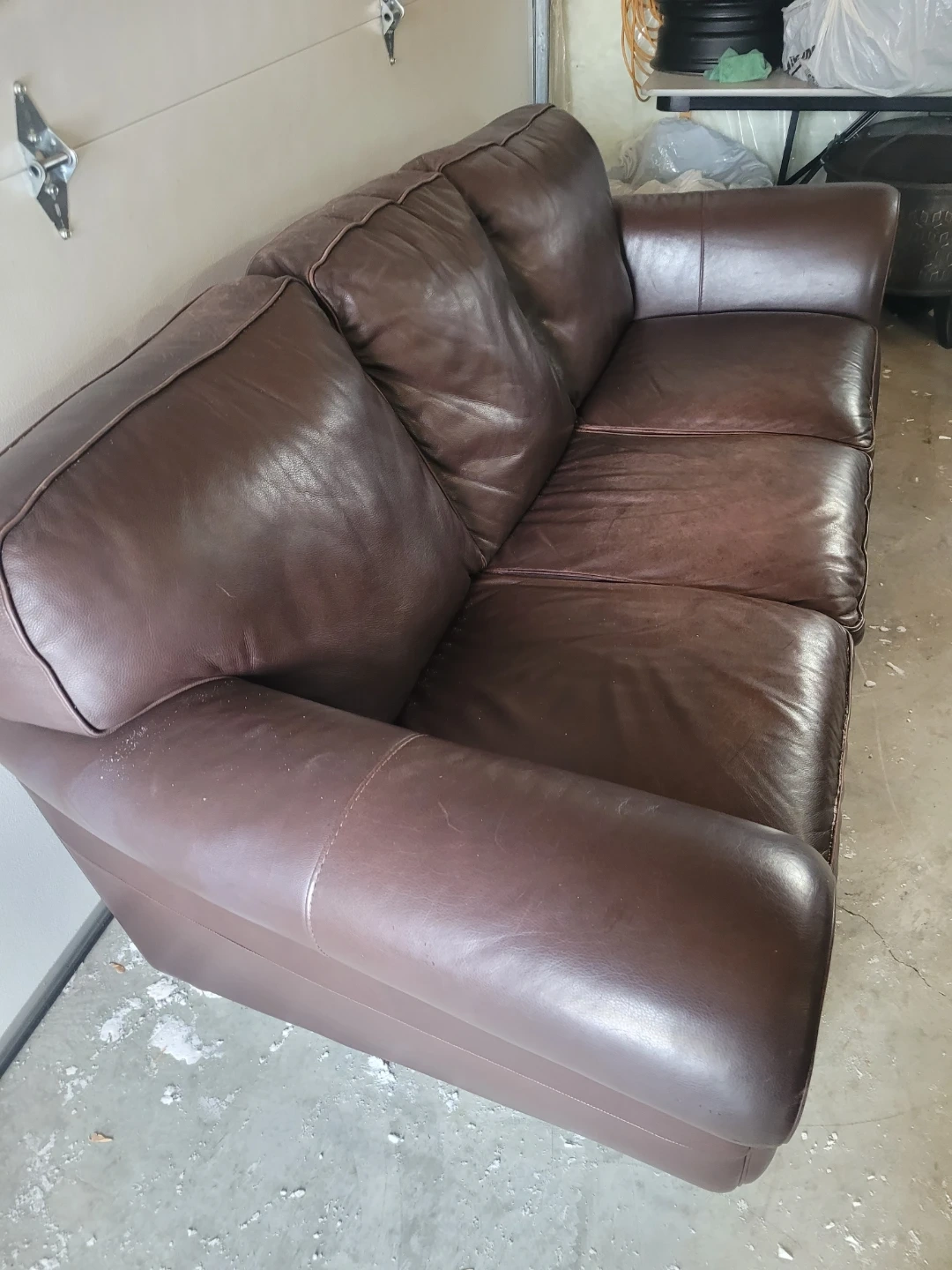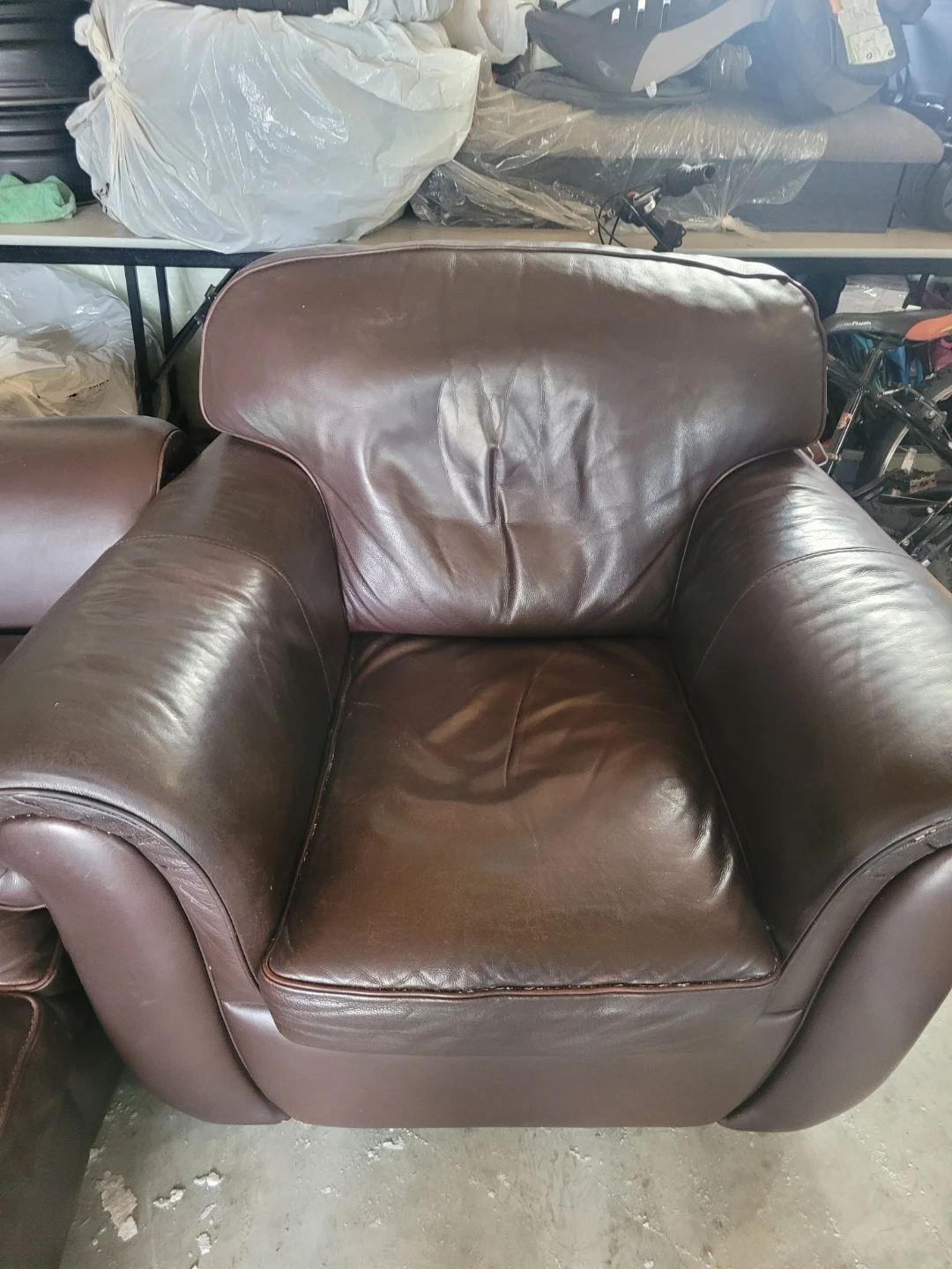 A comfortable brown leather sofa and matching armchair set. The set is made from genuine leather. This furniture would be a great addition to any living space.
