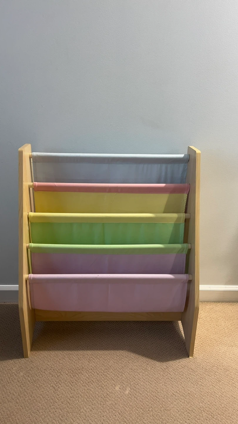 This colourful book organizer features a wooden frame and five fabric pockets. It's designed to hold books and keep them tidy. Great for a child's room!