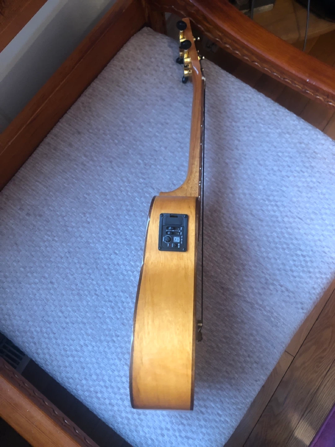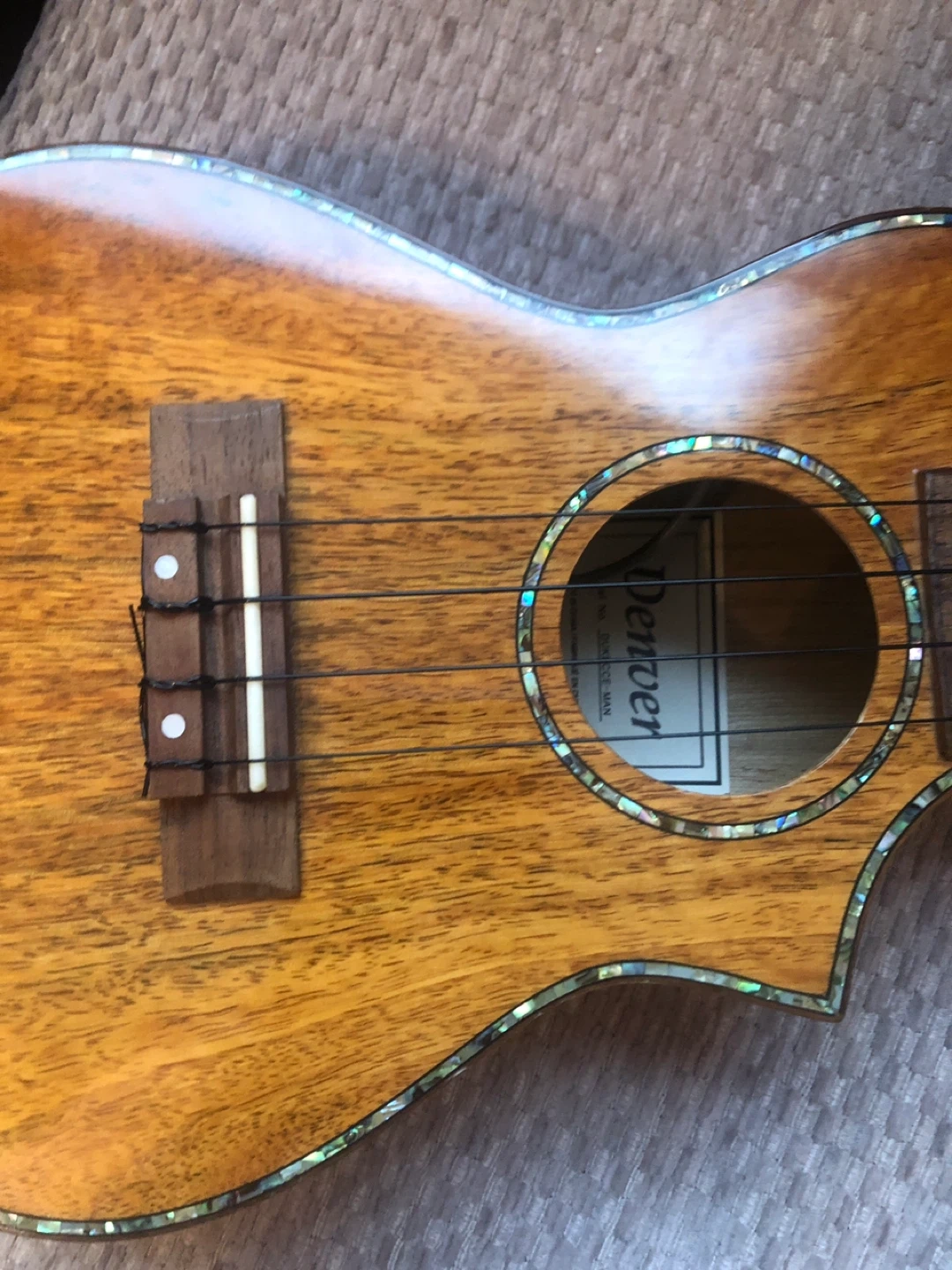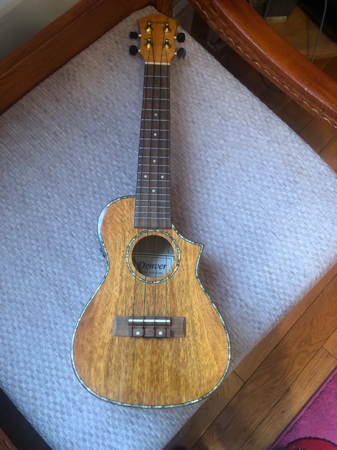 This is a Denver brand electric ukulele. It includes a black gig bag for easy transport and a capo. The ukulele has a natural wood finish and a built-in tuner.