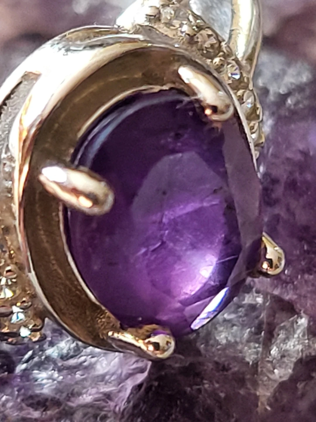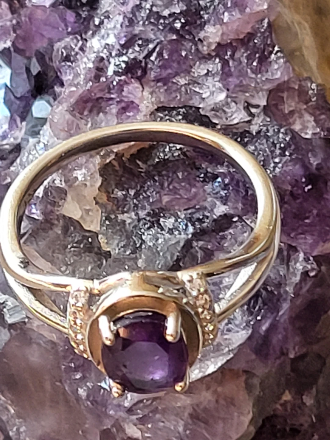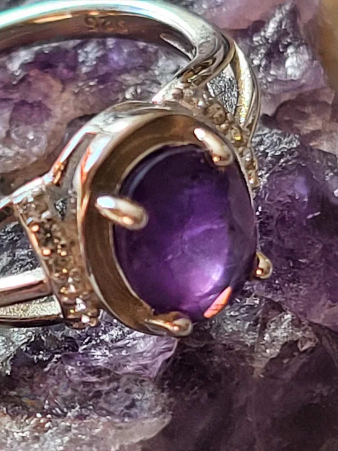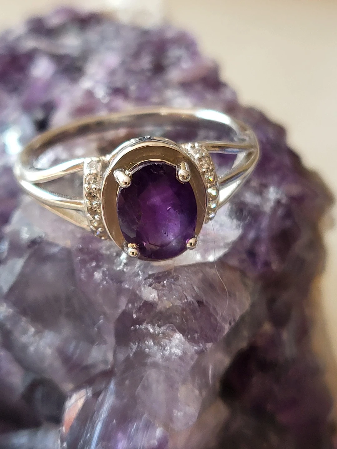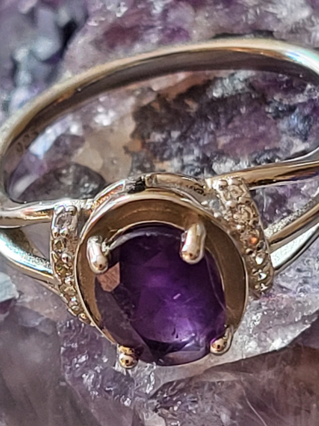 Beautiful oval-cut amethyst ring set in sterling silver. Features small accent stones on the band for extra sparkle. Stamped with "925" indicating sterling silver quality.
