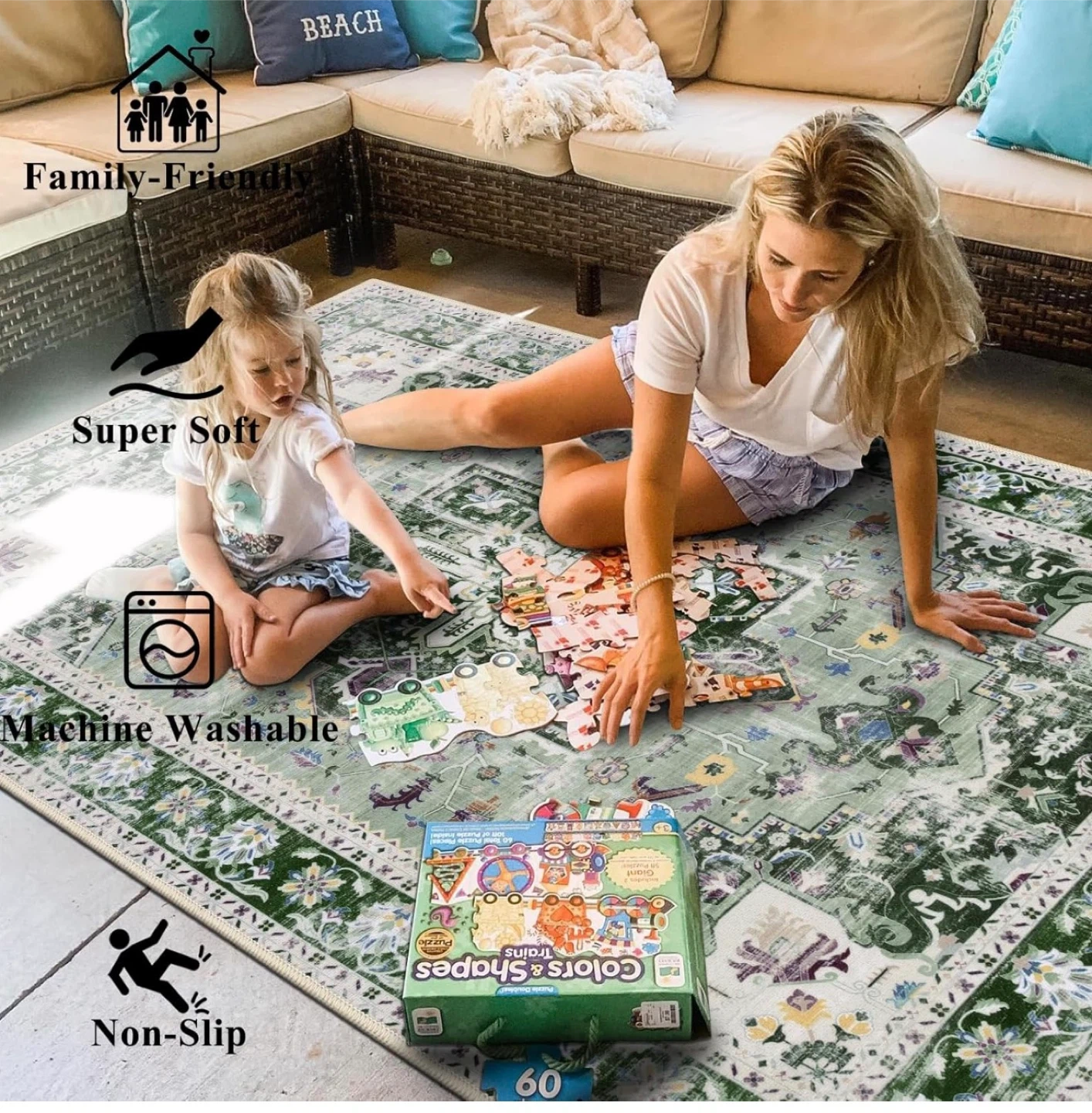 Add a touch of elegance to your home with this beautiful Persian-style area rug. It's super soft and machine washable, making it a practical choice for any busy household. The non-slip backing ensures it stays in place, and it's family-friendly. It features a vintage-inspired pattern in green and cream.