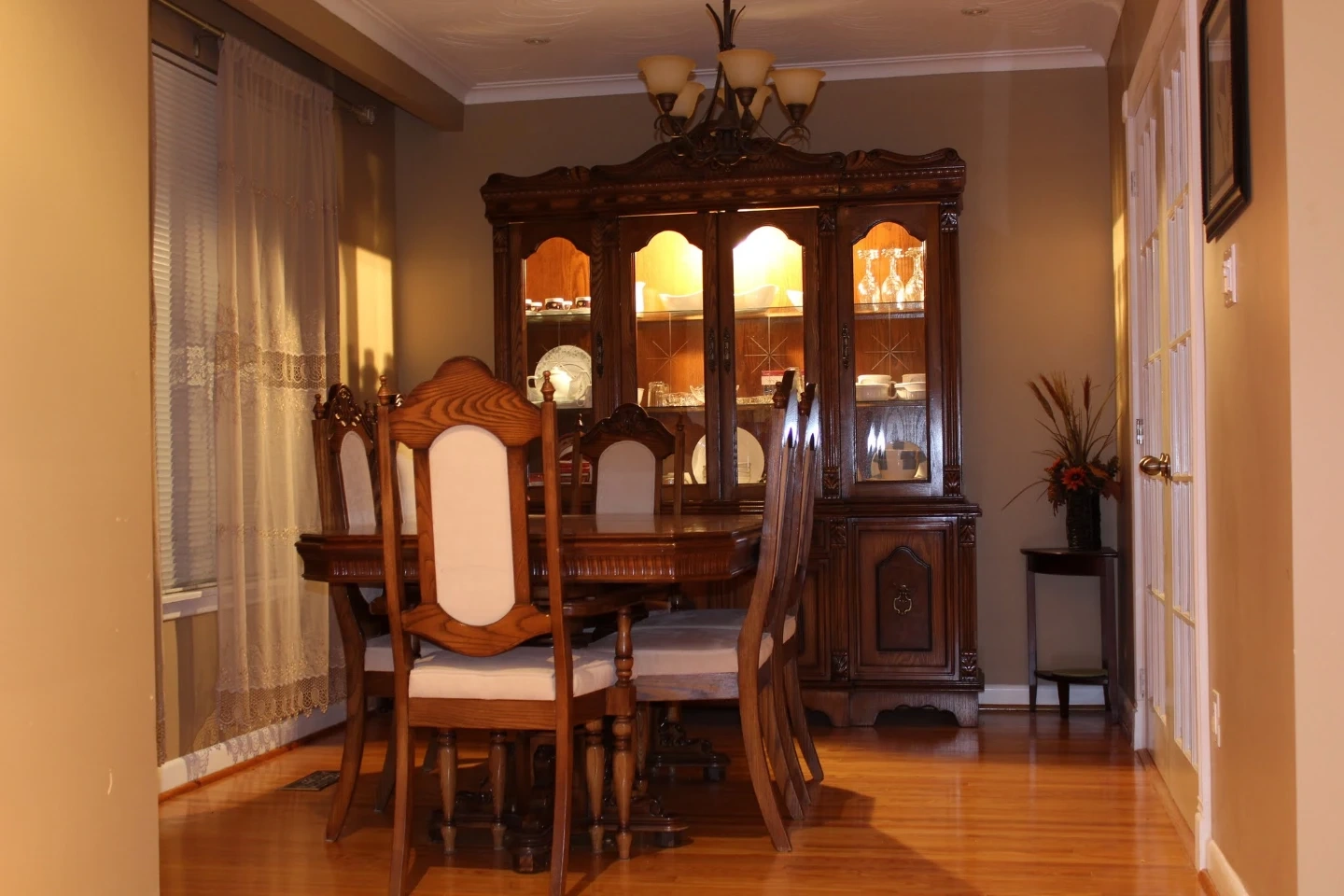 Moving out sale. Must go. This solid oak china cabinet features a beautiful dark wood finish and glass-paned doors with intricate detailing. It offers ample shelving space for display and storage in its upper section, with additional cabinets and drawers below. It's a sturdy piece that's perfect for a dining room or living area to showcase your collectibles or serveware.