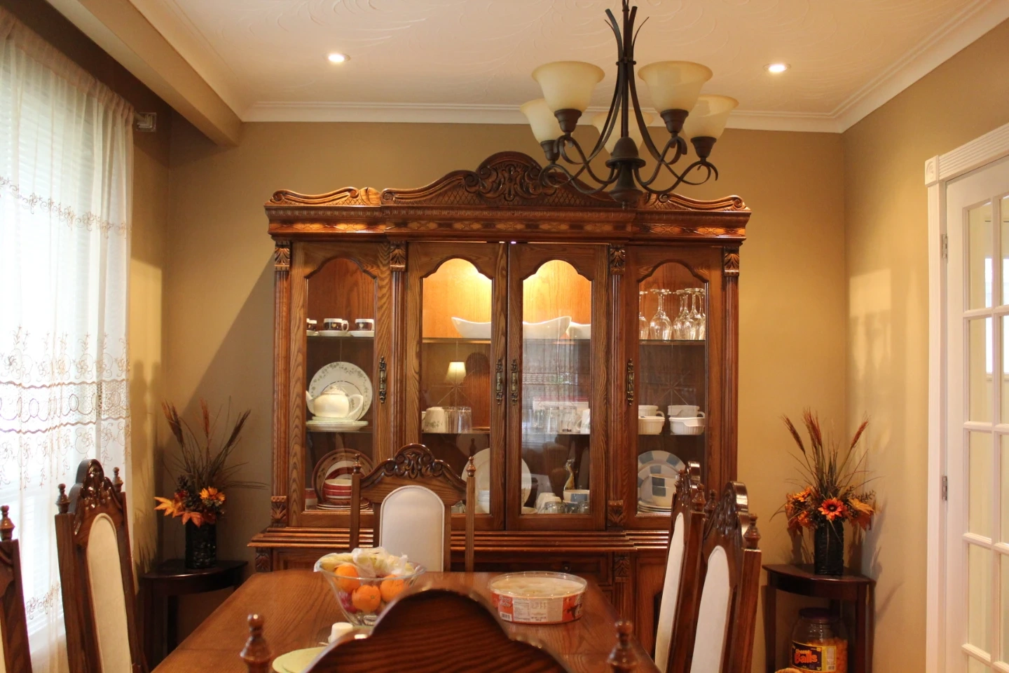 Moving out sale. Must go. This solid oak china cabinet features a beautiful dark wood finish and glass-paned doors with intricate detailing. It offers ample shelving space for display and storage in its upper section, with additional cabinets and drawers below. It's a sturdy piece that's perfect for a dining room or living area to showcase your collectibles or serveware.