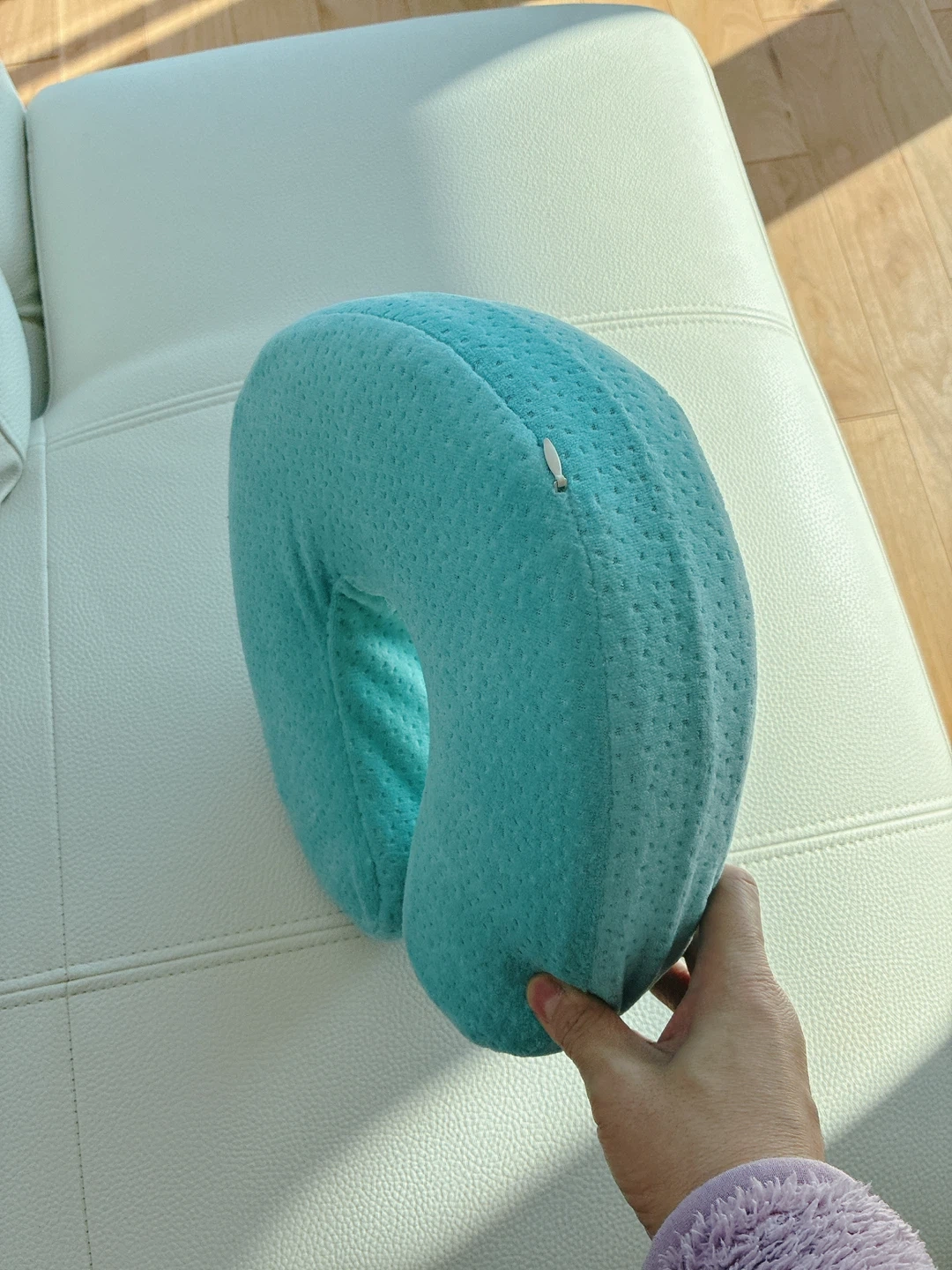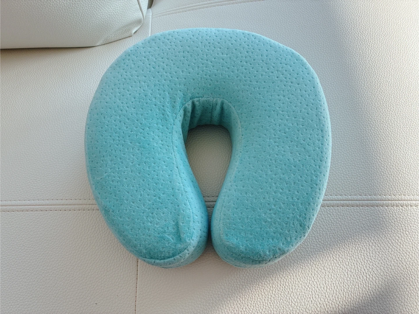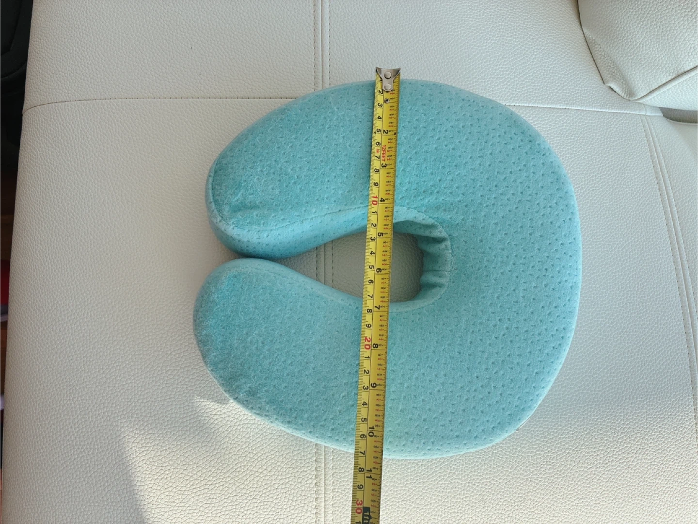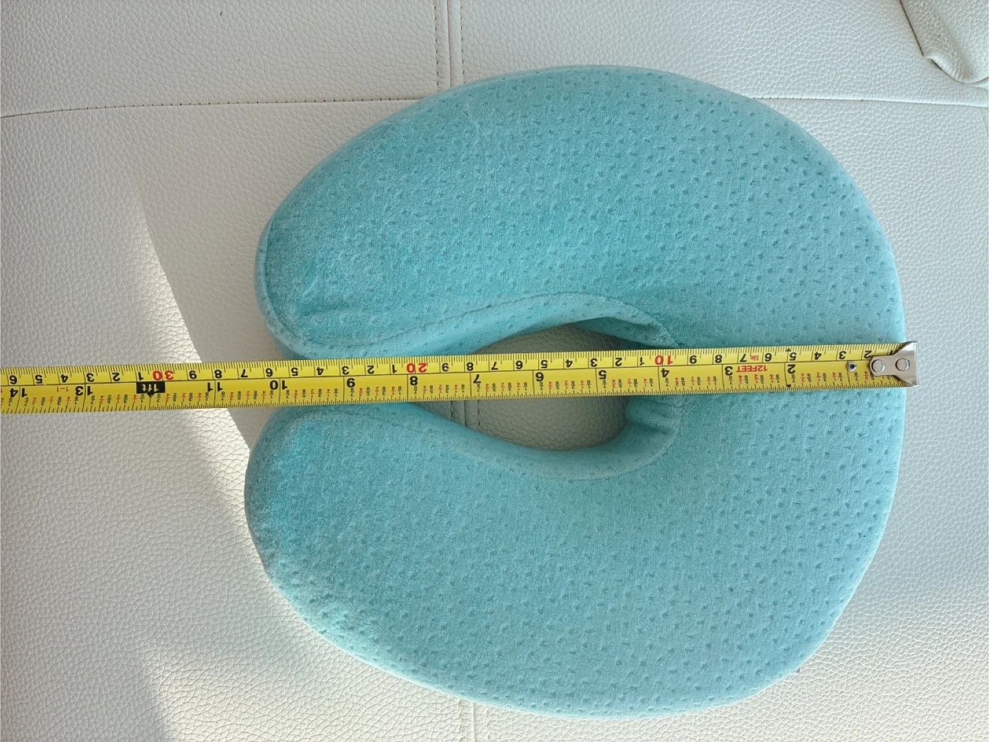 This teal neck pillow offers comfortable support. Its soft, textured fabric feels great against your skin. It measures approximately 11 inches wide by 10 inches high. Great for travel or relaxation!