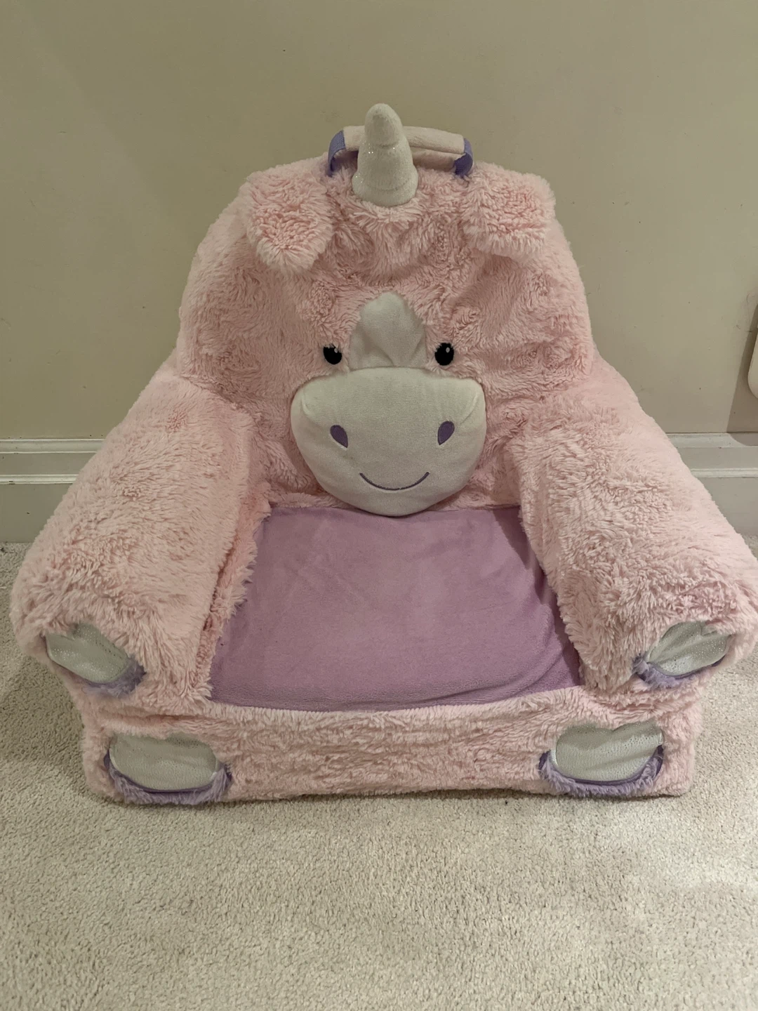 Super soft and comfy plush unicorn seat for kids. It's pink with purple accents and has a cozy sitting area. Perfect for a toddler's room or play area!