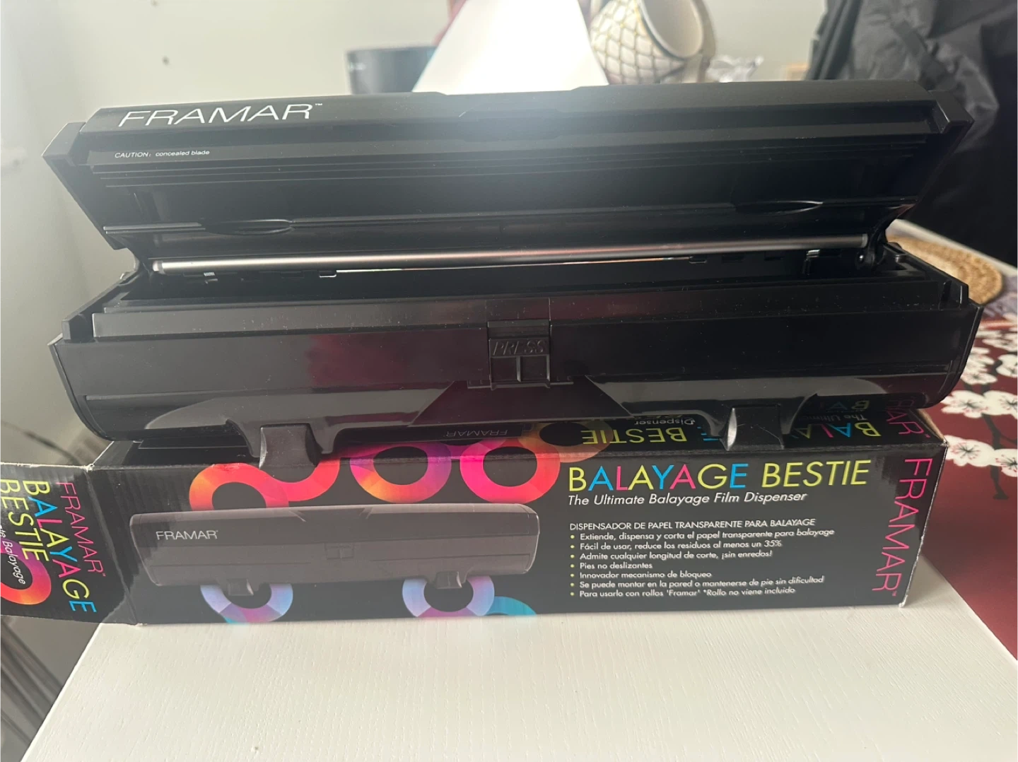 This is the Framar Balayage Bestie Ultimate Film Dispenser. It's designed for easy extension, dispensing, and cutting of balayage film. It helps reduce waste and maintains precise cutting length.