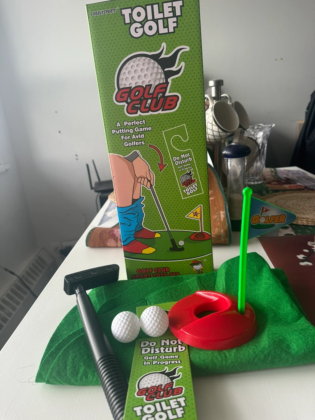 This is a Toilet Golf putting game set. It includes a golf club, two balls, a putting green mat, and a putting cup with a flag. It's a fun game for avid golfers and comes with a 'Do Not Disturb' sign.