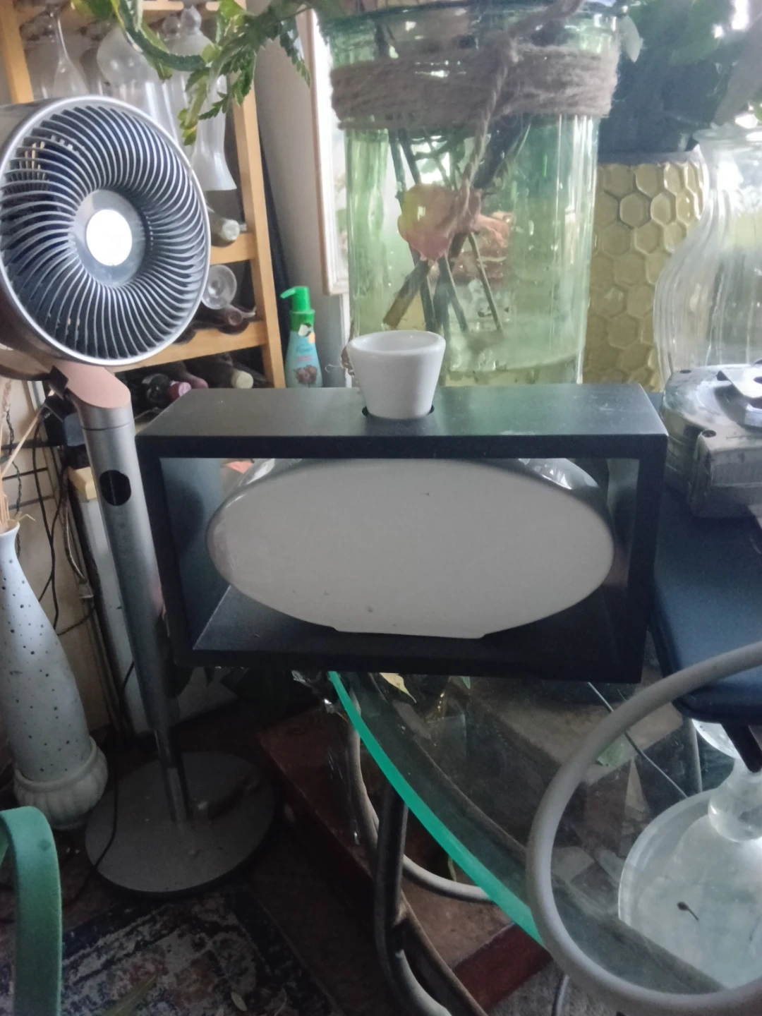 This is an oval white vase with a black stand. It has a small white cup on top. It's a unique decorative piece.