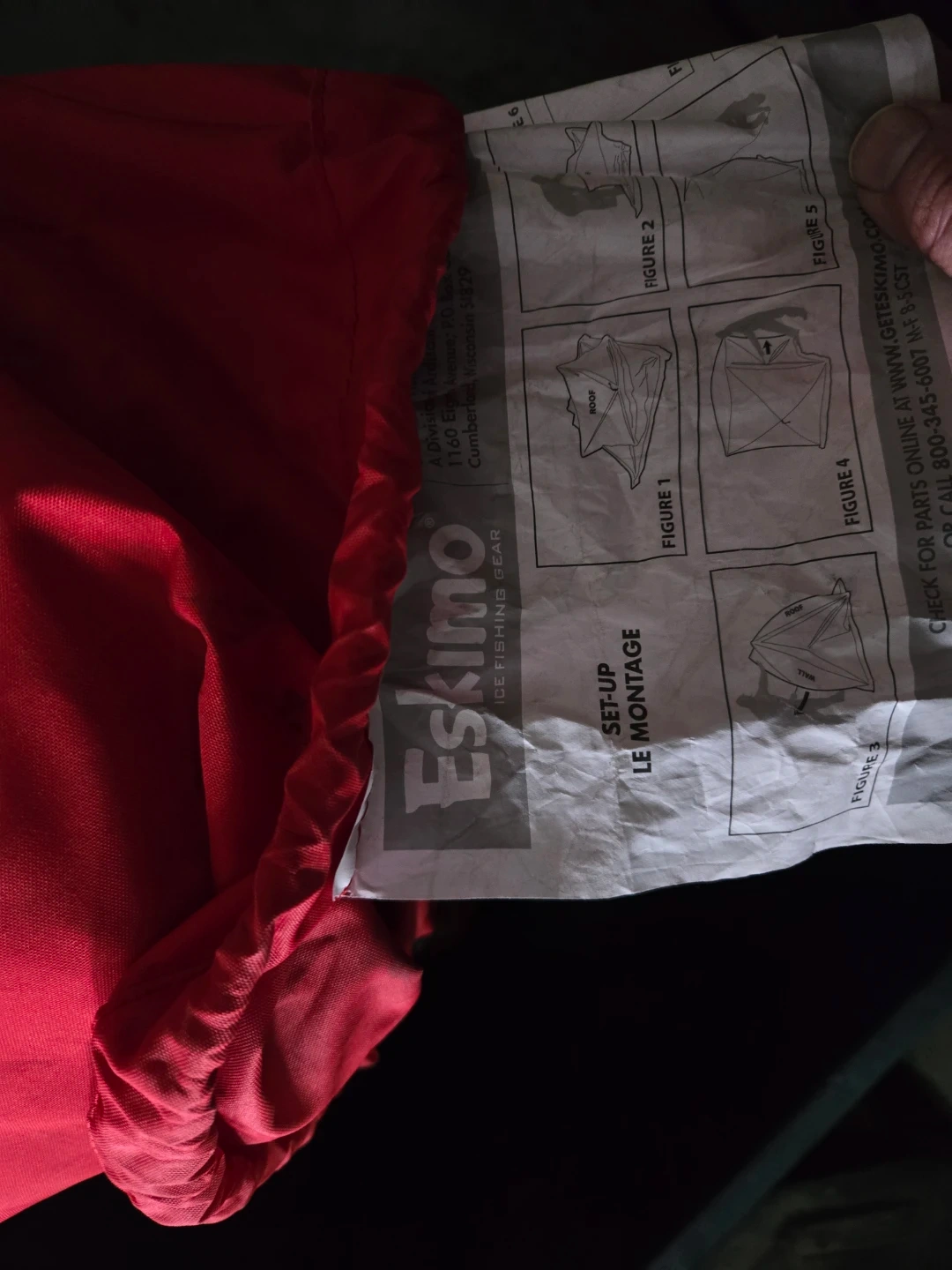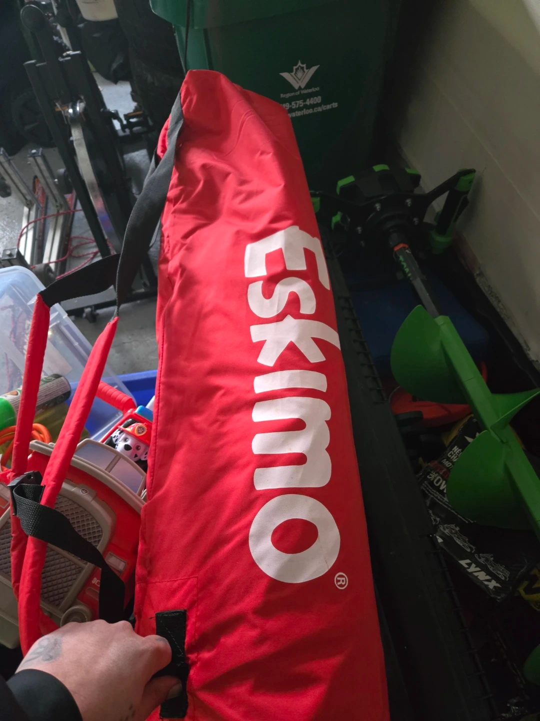 This is an Eskimo ice fishing shelter. It's made of durable material for use on the ice. It's designed for ice fishing.