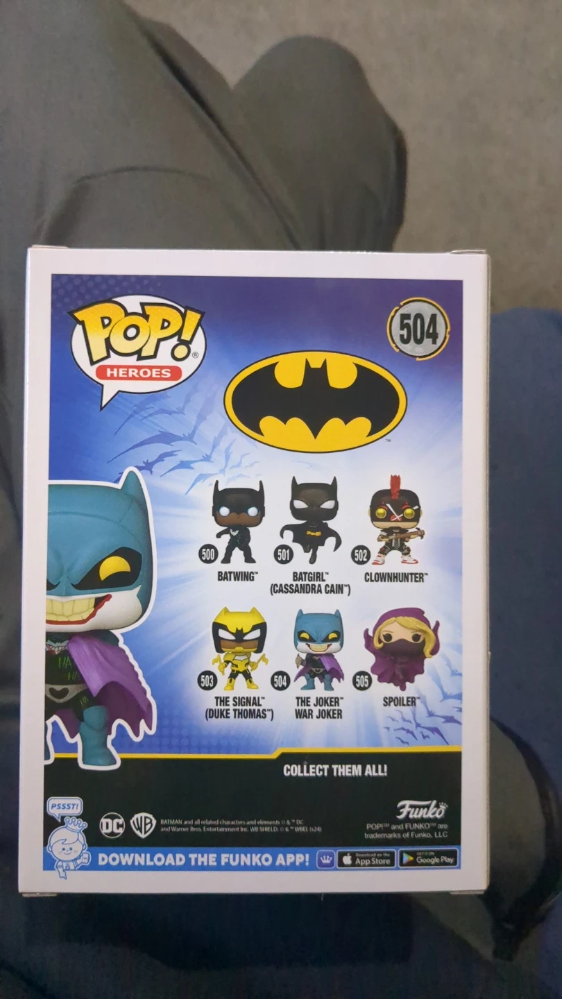 This is the Funko Pop! Heroes vinyl figure of The Joker, War Joker edition, number 504. It's part of the DC Heroes collection. The figure comes in its original box.