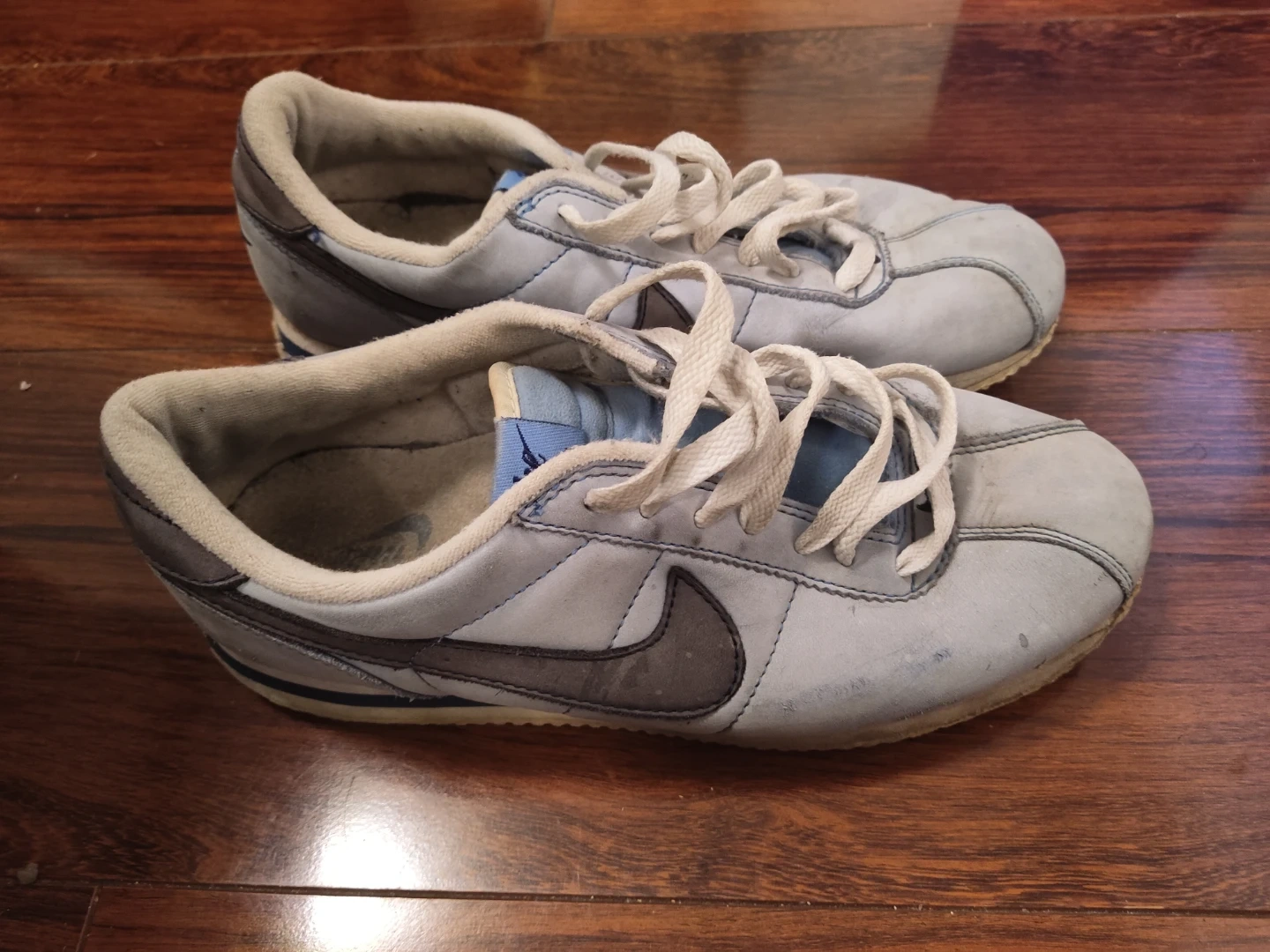 These are a pair of light blue Nike Cortez athletic shoes. 9.5 men's